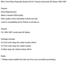 You may also like 2X Front Stabiliser Anti Roll Bar Bush For BMW 5 6 7 Series 31356753928 23.85 USD Free shipping Front Sway Bar Links Disconnect For 2007-2021 Wrangler JK JL 2.5-6”Lift 84.85 USD Free shipping Front Left & Right Sway Bar Link for Mercedes W166 1663200789 1663200889 39.85 USD Free shipping Sway Bar Rod Bush Rubber Chassis End Kit Pair for Nissan Patrol GQ Y60 GU Y61 26.85 USD Free shipping 2x Front Anti Roll Bar Stabiliser Bushes RBX500160 for Range Rover L322 2002-12 23.85 USD Free shipping 2x Front Suspension Sway Bar Stabilizer Bushing 68213310AA for Grand Cherokee 19.85 USD Free shipping 2pcs Front Sway Bar Link for Opel Vectra C Signum Saab 9-3 13237130 2441725 45.85 USD Free shipping Rear Suspension Spring Bump Stop R/H OR L/H For Toyota Hilux MK5 48306-35110 34.85 USD Free shipping 2* Front Stabilizer Sway Bar Bushing for F10 F11 F12 520i 528i 640i 31356777933 16.96 USD 17.85 USD Free shipping 5% off 8Pcs Front+Rear Sway Bar Bushes Kit For Toyota Landcruiser 80 Series 1993-1997 Feature: Direct Replacement. Meet or exceed OEM quality. Strict quality control standards to Build and test. Look for compatibility list for fitment or just ask us. Fitment: For 1993-1997 Landcruiser 80 Series Package included: 2x Front inner sway bar rubber bushes 31mm 4x Front outer sway bar rubber bushes 2x Rear sway bar rubber bushes 25mm Notes: 1.Please check whether this item can fit on your car before purchasing -About US Founded in 2012, VIPJQ have professional development and sales, and are involved in various products, providing customers with various high-quality products. Since its establishment, VIPJQ has always adhered to the service concept of "customer first" and the management concept of "pursuit of quality", and is committed to providing customers with high-quality original designs. We commit to provide you the best innovative, quality products & professional services with competitive prices. We value every customer, and we look forward to providing solutions for your business needs to help your business achieve its goals, please contact us immediately! We are all about you! We are a Japanese seller,but with large warehouse in USA. We are profesional on Auto Parts,Car Parts,Motorcycle Parts,3C,other hot sale items and so on. We aim to provide to customers high quality product and best service. -About Shipment&Returns The item usually will be dispatched within 3 days after you ordered.All are free shipping. And it usually takes 3-10 working days to delivery depends on buyers' address or other majeure on the way. If you are not satisfied with the items and want to return the item,we hope you could message us first,we will give you the return details, we think we could give you the best service to save your time and money.Thank you. -About Feedback&Customer Service If you are enjoy your shopping here,not only enjoy the items but also the service,we are appreciate you could give us a 5-star feedback. If you are not satisfied with the item,before you give us the negative feedback,we hope we could give you the best solution through our commutication. We think we could do it if you give us the chance.Thank you.