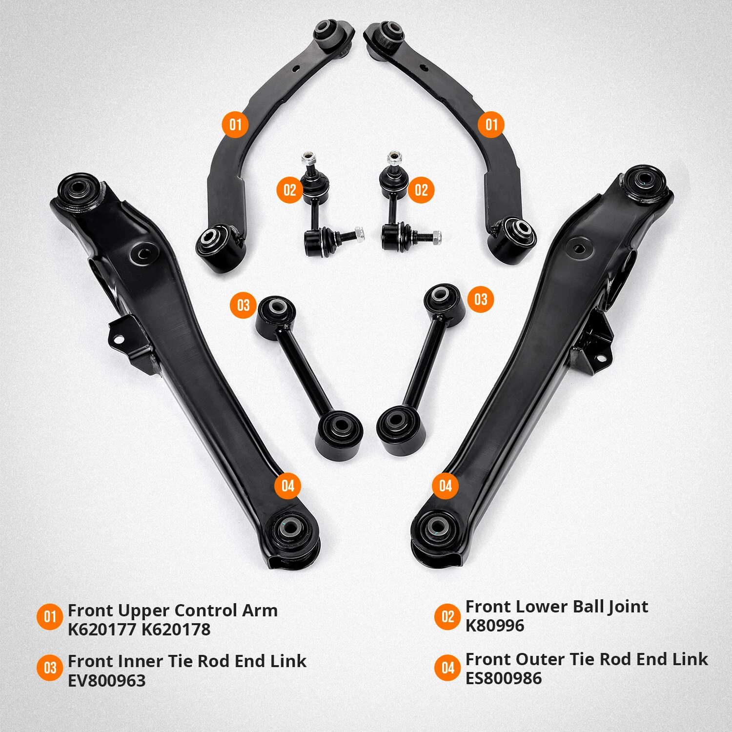 Specification Brand Ewayautosupplies Condition 100% aftermarket brand new and superior quality Interchange Part Number K641226,K641281,K641868,K750289 Quantity Needed Per Vehicle 8 Fitment Type Direct Replacement Type Control Arm & Ball Joint Assembly Surface Finish Standard Placement on Vehicle Left, Right, Rear, Upper, Lower Greasable or Sealed Sealed Package includes 2x Rear Lower Rearward Control Arms 2x Rear Upper Control Arms 2x Rear Lateral Links 2x Rear Sway Bar Links As the picture shown Features: 100% brand new in box High quality, brand new control arms Made with high strength steel tubing with solid plate mounting brackets for superior strength and durability. Anti-corrosion coating on the control arm for extended life. Welding done by robotic arms, uniform thickness, no blow holes, slag, cracks, tearing, or incomplete fusion. Measured by specialized inspection tools after welding to make sure assemble?hole , bushings insert, and installation sizes are proper. Professional Installer is Highly Recommended (No Instruction Included) Alignment Highly Recommended After Install Fitment: Fits for Jeep Patriot 2007-2009 2.0L 2.4L Fits for Jeep Compass 2007-2009 2.0L 2.4L Fits for Dodge Caliber 2007-2012 1.8L 2.0L 2.4L Note: 1. Please allow 1-3mm error due to manual measurement. Thanks for your understanding. 2. Please be noted that due to different settings of monitor, the color tone of the photo may be slightly different from the actual item. 3. Please feel free to contact us for whatever we can help via eBay message Payment The only payment method we accept so far is eBay Management Payment. If this brought up any inconvenience to you, please accept our apology. Any other question is welcome to ask through our excellent customer service. The return policy is straightforward. Our customers possess the right to Open-A-Return on any order received in 30 days . However, in a healthy transaction where no mistake is proved to be made by the Seller, the Buyer will be responsible for the Return Label Cost. Also, please note that a return on orders over 30 days old will be denied in any occasion. Shipping Shipping will always be Fast & Free. Whereas any payment upon the item was made, your item will be very well packed and sent within 1 to 2 business days (It's usually 1, and we put 2 just in case), and it should be safely delivered within 2 to 8 day s . During these days, no worry shall be concerned, so please sit back and wait for your package along the delightful sunshine and peaceful moonlight. To be explicit, your item will be shipped via Standard Shipping . Your carrier tracking number will be immediately sent to the e-mail address associated with your eBay account as label generated. You may keep track of your order at will. If any question or problem is raised during transition, please let us know and we will help till the end. Terms of Sale Sometimes things can go wrong no matter what. As a responsible seller, we help in any problem, such as damaged goods, defective products, unclear descriptions, or etc., that you consider as a dissatisfaction, the door to our Customer Service is always widely opened for you. Please let us know how we can help if you needed ANYTHING ANYTIME! Yet please also notice that any collaboration needs time to reach a solution. * For a delayed or lost package , as we actively communicate with our colleagues and shipping carriers. This process could take up to 14 days, so if the item is needed urgently, we highly recommend you to place another order. * For a presumably defective product received , our customer service will work this out with you in a quick manner. In this case, please describe the issue as clear as possible. Pictures and videos can be extremely helpful and time-saving here. * For any confusing or false description in the listing that causes a mis-purchase, please kindly remind us so we can improve our listings and continuously offer a better purchasing experience to you and to all our customers as well. Did it occur to be our mistake for the faulty transaction, we would be responsible for the return cost. Among all sorts of the problem, before the puzzle resolved or time expired, a refund or replacement will NOT be issued. We wish you understand the pressures here, and our effort will always come to your aid. About Us It's nothing about us. It's all about you . As informed above, the door to our Customer Service is constantly wide-open to you. If you were having any question, or just looking for someone to chat with, please feel free to contact us through Messages . We will get in touch promptly in 24 hours . Concerns wouldn't be necessary since we promised to be on your side. You can just enjoy a nice day while waiting for our reply. When there was an accident like business getting busy or filing bankruptcy or people taking a break or getting off work or getting fired or attacked by aliens or something else which delays our response, might us be forgiven. You know, things could happen. (Finger crossed) Last thing last. After a transaction is completed, our customers are always welcome to share their feelings about the product with us. As you are well satisfied, feel free to tell us and all fellow customers your story on Feedback or Ratings while convenient. Meanwhile, we do not escape from any negative feedback deserved. Yet before you put your fingers down and things get irretrievable, we are always ready to learn our lessons and make things right. Just contact us if you are not happy! Business is just not easy these days. (Sign) So, thank you so much for reading such a loooooooooooong description. We sincerely look forward to doing business with you. If business happens, I personally represent my company and my families who also feed on these transactions to send you our deepest gratitude. (Smile) Nevertheless, no matter what, please enjoy everyday, keep health, joy, and of course, wealth. We wish you all the best and wait to see you agai