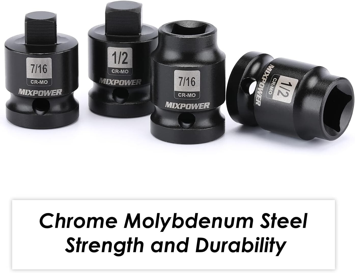 【Premium CR-MO】Manufactured from premium impact grade chrome molybdenum steel construction with corrosion-resistant black phosphate finish for durability. 【Set Include】1/2" Dr. Male: 7/16",1/2", 5/8", 9/16; 1/2" Dr. Female: 7/16",1/2",5/8”, 9/16" 【Application】Tapered Male Square Drive and Chamfered Female Square Drive, aligns socket to fastener quickly, Low profile design, can easy to access tight spaces, fit any 1/2" drive ratchets / bars etc. 【Laser etched】Large, high-contrast size marking is permanently laser etched and easy to read, even in low light.