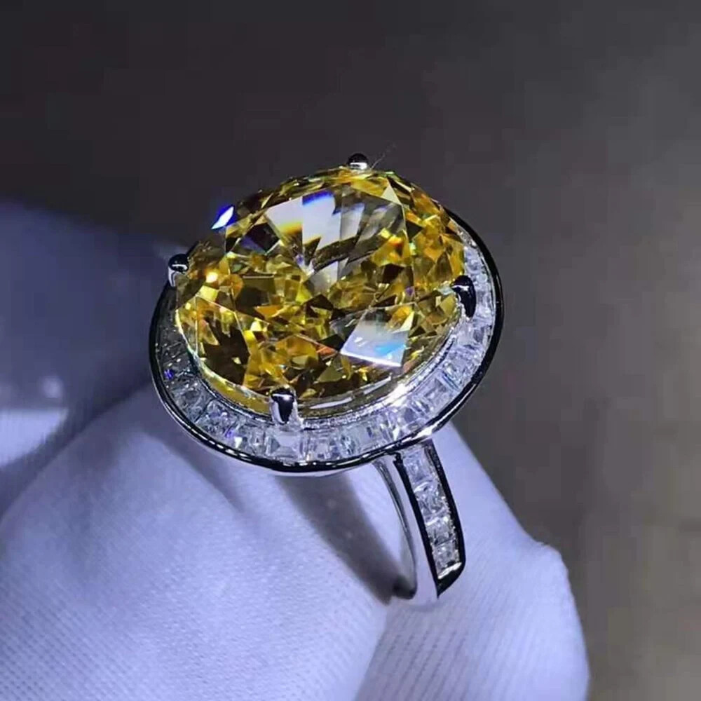8 Carat Oval Cut Moissanite Ring Vivid Yellow VVS Halo Bead-set Cathedral ๐ Available Metals: A) 5X Platinum Vermeil, B) Solid 10K Gold, C) Solid 14K Gold, D) Solid 18K Gold, E) Solid 950 Platinum. โ HIGHEST QUALITY Certified White Gold, Rose Gold, Yellow Gold & 950 Platinum. (Not Trash). ๐ Ring Size: 2,3,4,5,6,7,8,9,10,11,12,13,14,15,16 and anything between these ring sizes available. It could be 1/4, 1/2, or 3/4. We Fit It to your Exact Finger Size no matter what size you want. ๐ Main Stone: HARDEST Quality VVS GRA Certified Hand Cut Moissanite (Pass Diamond Testers) โจ Side Stones: Premium Quality VVS Moissanite. (Pass Diamond Testers) ๐ Certified: GRA - GRC ๐ Polish: Excellent Polish. Shiny & Clean for Maximizing Sparkles. โฆ Cut: Hand cut Excellent cut & Symmetry with Crisp & Sharp Edges/Corners. ____________________ ๐ 100% Handmade with GORGEOUS & Accurate Details. Itโs an Art, not only a Valuable Material. ๐ 60 Days Money Back Guarantee for Any Reason even if you don't Fall In Love with it. ๐คฏ FREE LIFETIME Main Stone Warranty & Side Stone Replacement. (No Color Change). ๐ FREE LIFETIME Jewelry Cleaning & Re-plating. ๐ Hypoallergenic. Skin Friendly. Doesnโt cause any type of Allergies. ๐ Customizable with/to Your Favorite Stone/Jewelry Type & Shape. ๐ FREE STUNNING Random GIFTS On Every Order (we sell them for +$200 up to over +$700). ๐ฅฐ Amazing Wooden Gift Boxes for Your Main Jewel & its Gifts. ๐ฅณ Gift Wrapping Available (we wrap with no tags or receipts, ready to present). ๐คฉ VIP Customer Service to Make Your Dreams Come True in the Most Fantastic Way. ๐ FREE SUPER FAST FedEx Express Shipping. ____________________ ๐โ + Our 5X Platinum Vermeil: Platinum is 9.4 times RARER & slightly more DURABLE than gold. Rings with platinum end up more EXPENSIVE than gold because the DENSITY of platinum is a lot HIGHER and the QUALITY is EXTREMELY PURER. Rings THICKLY plated FIVE TIMES with platinum offer MUCH STRONGER PROTECTION against wear and scratches than gold plated jewelry. Therefore they LAST the LONGEST while giving you a SHINY LOOK ALL THE TIME. ๐โ + Our Rare Stone Quality: Here you have the NATURAL looking color of the diamonds in a RARE size with extraordinary VVS1 clarityโฆ Weโre offering the GREATEST QUALITY and VALUE at the BEST PRICE with this design by using very SPECIAL types of GRA Certified Moissanite stones. Natural diamonds in this color, clarity and size are super rare and very hard to find. Some of them easily cost over $10,000 per carat. (please message me for natural diamonds like this color, size and shape so I can give you the accurate price based on your preferences) ____________________ ๐ข๐๐ FREE FAST EXPRESS SHIPPING Processing + Shipping = Receiving Time PROCESSING: Only 1 available. This ring will be shipped within 48 hours. (Other sizes require customization for 2-3 weeks. ) SHIPPING: 2-6 days via FedEx Express for FREE โ Youโll get updated with the tracking code, once your package is shipped. โ We ship with insured FedEx only which is very secure. โ An adult signature is required at the time of delivery. _____________________ โ๐๐ CUSTOMIZATION/PERSONALIZATION: Custom orders with me are SUPER EASY & COMFORTABLE, no matter if youโve never done it before or youโve done lots of them. ๐ค I break down everything into small steps. And we go through the steps one by one together. On each step, youโll get to pick or guide me from the options I represent. ๐ Once we get to the end, your dream comes true. ๐คฉ๐ Because every single detail is just exactly what you want. ๐๐ ๐จ HOW TO DESIGN YOUR RING: A โ Send me some/one image similar to your idea. Or tell me whatโs your favorite shank, profile or stone? So I can show you some options to choose from. B โ Next, I will start designing it right away. Iโll send you some screen shots from what I designed. We can adjust any part of it together, until itโs exactly the way you want it to be. C โ After we get to the ideal conclusion, Iโll render several Ultra High Quality 3D images and a 4K video, so you see what the end result is gonna look like in reality. D โ The moment you approve everything, we start making it. Once itโs finished, weโll ship it the same day. + 3D IMAGE SAMPLES: Before you order yours, you can ask me for some samples of the 3D rendered images and videos. Youโre gonna absolutely love the quality, because they look like real rings. ๐คฉ๐ + Designing your dream ring with me is gonna be a fantastic experience. While you just sit and order, youโll watch how I take care of everything from your idea to the end product in the SIMPLEST & GREATEST way possible.โ โ------------ ๐ AVAILABLE GEMS: All stones are available - Colorless & Colorful Moissanite or Simulated Moissanite. Natural & Lab Grown Diamonds in Colorless or Colorful. Natural and Lab made Emerald, Ruby, Sapphire, Amethyst, etc. Just ask! ๐ฅ AVAILABLE METALS: All metals are available - 925 Sterling Silver, 5X Platinum Vermeil, 9K Solid Gold, 10K Solid Gold,14K Solid Gold, 18K Solid Gold (in Rose, White or Yellow), Platinum 950. ๐ AVAILABLE MATCHING PIECES: We can make matching pieces for this product. Engagement Rings, Bridal Sets, Wedding Bands, Earrings, Studs, Hoops, Bracelets, Bangles, Necklaces, Pendants, and anything youโd dream of. We can design all to set with this item. ๐จ๐จ๐ง๐ฆ AVAILABLE OTHER JEWELRY: We make jewelry as per occasion and celebration like birthdays, birth months, anniversaries, motherโs day, valentine's day, fatherโs day, memorials, thanksgiving, zodiac signs, graduation days, and many more per your request. ____________________ โโโโโ 5 STAR PRISTINE PROMISES: โฆ๏ธ 100% Satisfaction Guaranteed โฆ๏ธ Ethically Sourced โฆ๏ธ FREE Lifetime Ring Resizing โฆ๏ธ FREE Complimentary ENGRAVING โฆ๏ธ 100% Co