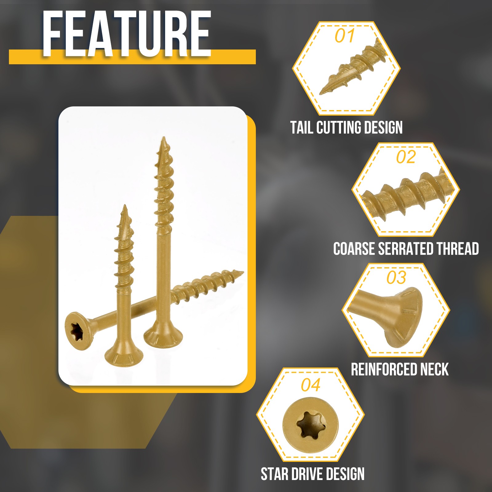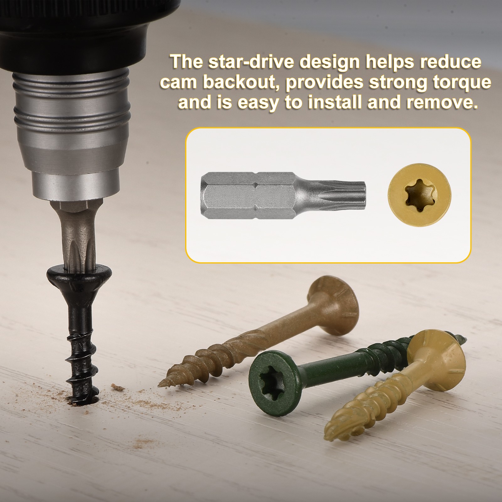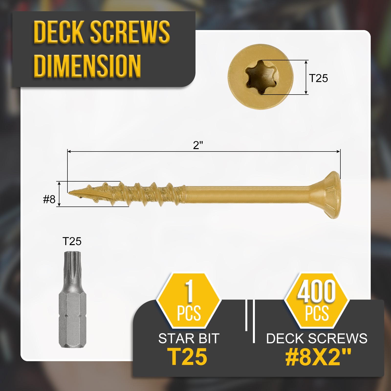 Document Product Details:Color: TanMaterial: Carbon SteelScrew Size: #8x2"(Thread Dia x Length)Tail Type: Type 17Slot number: T25Package Content: 400pcs x Deck Screws & 1pcs Star BitMaterial - These deck screw bolts are made from carbon steel, offering high hardness and wear resistance for improved durability. Tested in a 1000-hour salt spray test, they show good corrosion resistance, making them a reliable choice for long-term use in various conditions. Designed for outdoor applications, these screws deliver consistent performance.Feature - The deck screw's star-drive design helps reduce cam-out, provides strong torque, and ensures a smooth, secure drive. The Type 17 point allows for easy penetration into hardwoods, softwoods, and pressure-treated lumber. The coarse, serrated threads offer a strong grip and secure hold, reducing board separation and enhancing structural stability.Application - Deck screws are perfect for decks, fences, frames, farms, ladders, outdoor furniture, pet houses, wooden walls, DIY projects, and more.Notice - The pointed screw design does not require pre-drilling. Tighten the screws tightly, but avoid over-tightening to prevent stripping the wood or damaging the screw head. #8x2" Deck Screws - 400Pack - Carbon Steel Screw W/ T25 Star Bit - Tan Product Details: Color: Tan Material: Carbon Steel Screw Size: #8x2"(Thread Dia x Length) Tail Type: Type 17 Slot number: T25 Package Content: 400pcs x Deck Screws & 1pcs Star Bit Material - These deck screw bolts are made from carbon steel, offering high hardness and wear resistance for improved durability. Tested in a 1000-hour salt spray test, they show good corrosion resistance, making them a reliable choice for long-term use in various conditions. Designed for outdoor applications, these screws deliver consistent performance. Feature - The deck screw's star-drive design helps reduce cam-out, provides strong torque, and ensures a smooth, secure drive. The Type 17 point allows for easy penetration into hardwoods, softwoods, and pressure-treated lumber. The coarse, serrated threads offer a strong grip and secure hold, reducing board separation and enhancing structural stability. Application - Deck screws are perfect for decks, fences, frames, farms, ladders, outdoor furniture, pet houses, wooden walls, DIY projects, and more. Notice - The pointed screw design does not require pre-drilling. Tighten the screws tightly, but avoid over-tightening to prevent stripping the wood or damaging the screw head. Hot Item Payment 1.We accept eBay payment . 2.Payment must be received within 7 business days of auction closing. Shipping 1.We ship to your eBay or Paypal address. Please make sure your eBay and Paypal address is correct before you pay. 2.Items will be shipped within 1-3 business day when we received payment. 3.Delivery time depends on destination and other factors. Description Policy #8x2" Deck Screws - 400Pack - Carbon Steel Screw W/ T25 Star Bit - Tan Product Details: Color: Tan Material: Carbon Steel Screw Size: #8x2"(Thread Dia x Length) Tail Type: Type 17 Slot number: T25 Package Content: 400pcs x Deck Screws & 1pcs Star Bit Material - These deck screw bolts are made from carbon steel, offering high hardness and wear resistance for improved durability. Tested in a 1000-hour salt spray test, they show good corrosion resistance, making them a reliable choice for long-term use in various conditions. Designed for outdoor applications, these screws deliver consistent performance. Feature - The deck screw's star-drive design helps reduce cam-out, provides strong torque, and ensures a smooth, secure drive. The Type 17 point allows for easy penetration into hardwoods, softwoods, and pressure-treated lumber. The coarse, serrated threads offer a strong grip and secure hold, reducing board separation and enhancing structural stability. Application - Deck screws are perfect for decks, fences, frames, farms, ladders, outdoor furniture, pet houses, wooden walls, DIY projects, and more. Notice - The pointed screw design does not require pre-drilling. Tighten the screws tightly, but avoid over-tightening to prevent stripping the wood or damaging the screw head. Hot Item Payment 1.We accept eBay payment . 2.Payment must be received within 7 business days of auction closing. Shipping 1.We ship to your eBay or Paypal address. Please make sure your eBay and Paypal address is correct before you pay. 2.Items will be shipped within 1-3 business day when we received payment. 3.Delivery time depends on destination and other factors.