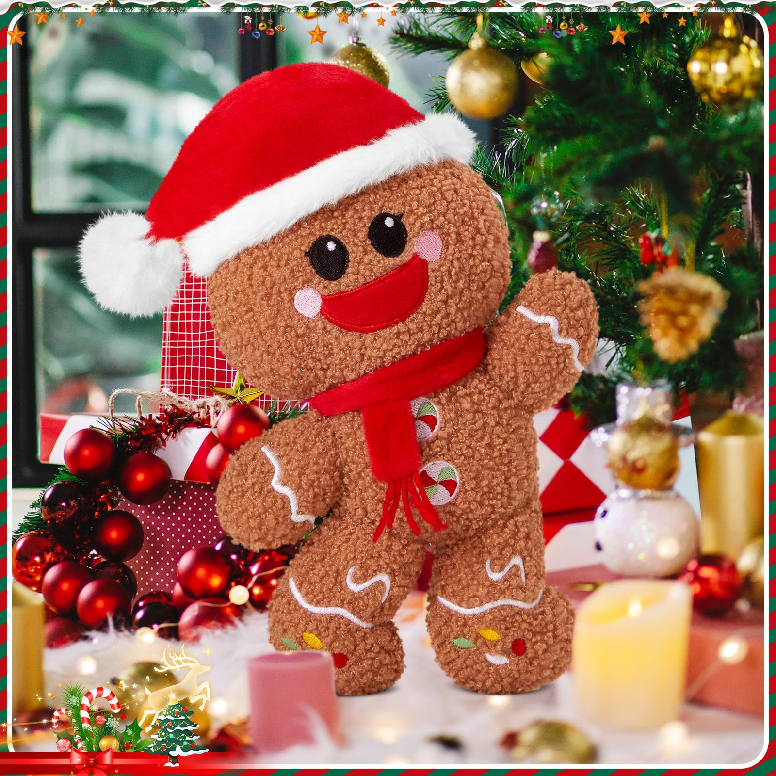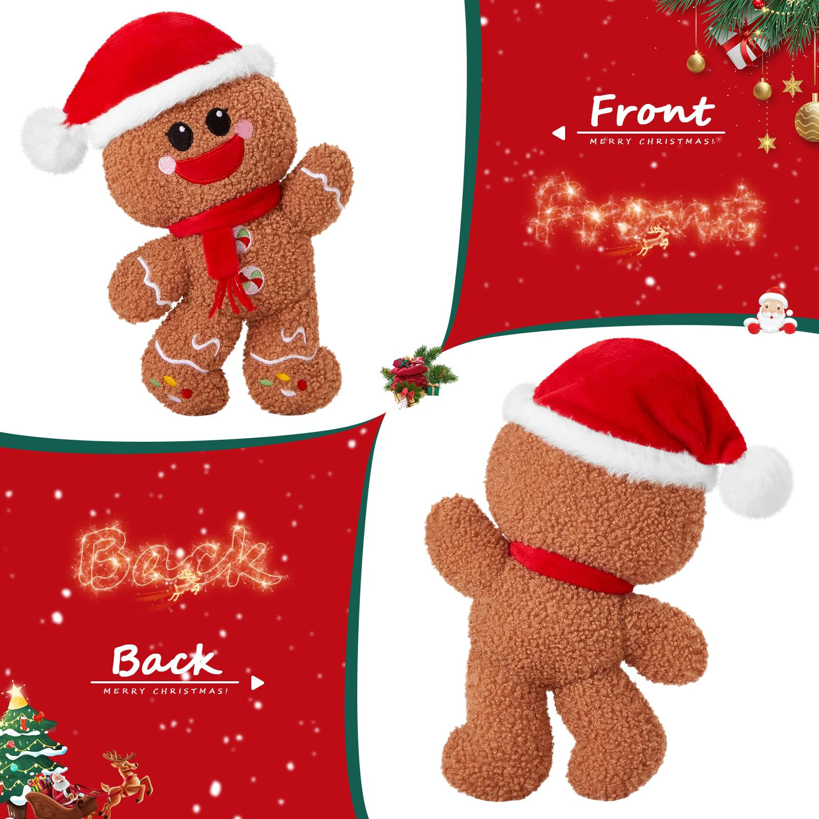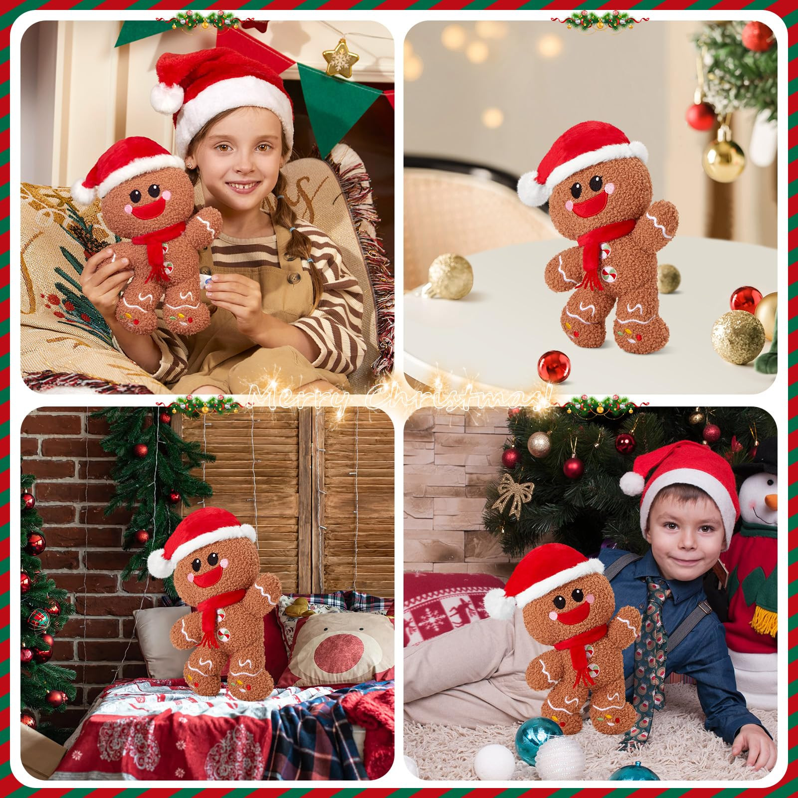 GINGERBREAD MAN PLUSHIE: Adorably cute 9” tall plush gingerbread man stuffed animal. He has a Christmas hat on his head and a scarf tied around his neck, and a very cute expression. Comfortable Fabric:Our material quality is very safe, made of high-end osmanthus velvet, completely harmless to the skin, suitable for children and adults of all ages Bring You Much Fun: You can put the gingerbread man plush in your car, your sofa and your bed, when you are tired, the gingerbread man stuffed animal will help you reduce your fatigue with its squishy touch and cuteness.You can also add the cuddly and soft gingerbread man plush to your Christmas collection. Multipurpose: Our gingerbread man plush is sure to be your friend. It's a perfect Christmas gift, Valentine's Day, plush for Christmas. for sofa, living room decor or Christmas party decorations. Quality after-sales service: We provide 30 days no reason to return the service, if you have any questions, please us, we will do our best to solve for you