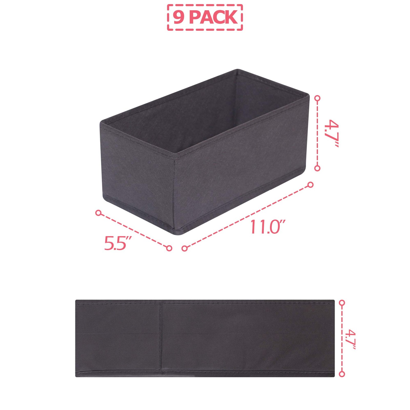 1, Classify Underwear, Bras, Socks, Ties, Scarves, Underpants, Undergarment, accessories etc. Easy to find which one you want to wear and never need to ransack all of your clothes. 2, These storage containers drawers Includes 9 medium rectangular organizer bins that can hold a variety of personal items. These stackable baskets dividers fit for men women male baby children kids girls boys. 3, The large collapsible cloths Storage Boxes Dresser Drawer organization provides lightweight solution and easy carrying to many personal storage needs. These soft adjustable compartments can be used for closet, bedroom, shelf, bathroom, wardrobe, chest of drawers, under bed storage, desk, bookshelf, nursery, office. 4, Made from non-woven fabric and Cardboard. Dresser drawer organizer measurements are: 11" X 5.5" X 4.7". Color: Dark Grey. Set of 9. 5, SPACE SAVING YOUR CABINET: Can be folded flat to save space when not in use. Multi-Purpose, suitable for baby clothes, underwear, bras, socks, makeup, belt, lingerie, panty, clothing, diapers, toys, crafts. Classify Underwear, Bras, Socks, Ties, Scarves, Underpants, Undergarment, accessories etc. Easy to find which one you want to wear and never need to ransack all of your clothes. These storage containers drawers Includes 9 medium rectangular organizer bins that can hold a variety of personal items. These stackable baskets dividers fit for men women male baby children kids girls boys. The large collapsible cloths Storage Boxes Dresser Drawer organization provides lightweight solution and easy carrying to many personal storage needs. These soft adjustable compartments can be used for closet, bedroom, shelf, bathroom, wardrobe, chest of drawers, under bed storage, desk, bookshelf, nursery, office. Made from non-woven fabric and Cardboard. Dresser drawer organizer measurements are: 11" X 5.5" X 4.7". Color: Dark Grey. Set of 9. SPACE SAVING YOUR CABINET: Can be folded flat to save space when not in use. Multi-Purpose, suitable for baby clothes, underwear, bras, socks, makeup, belt, lingerie, panty, clothing, diapers, toys, crafts.
