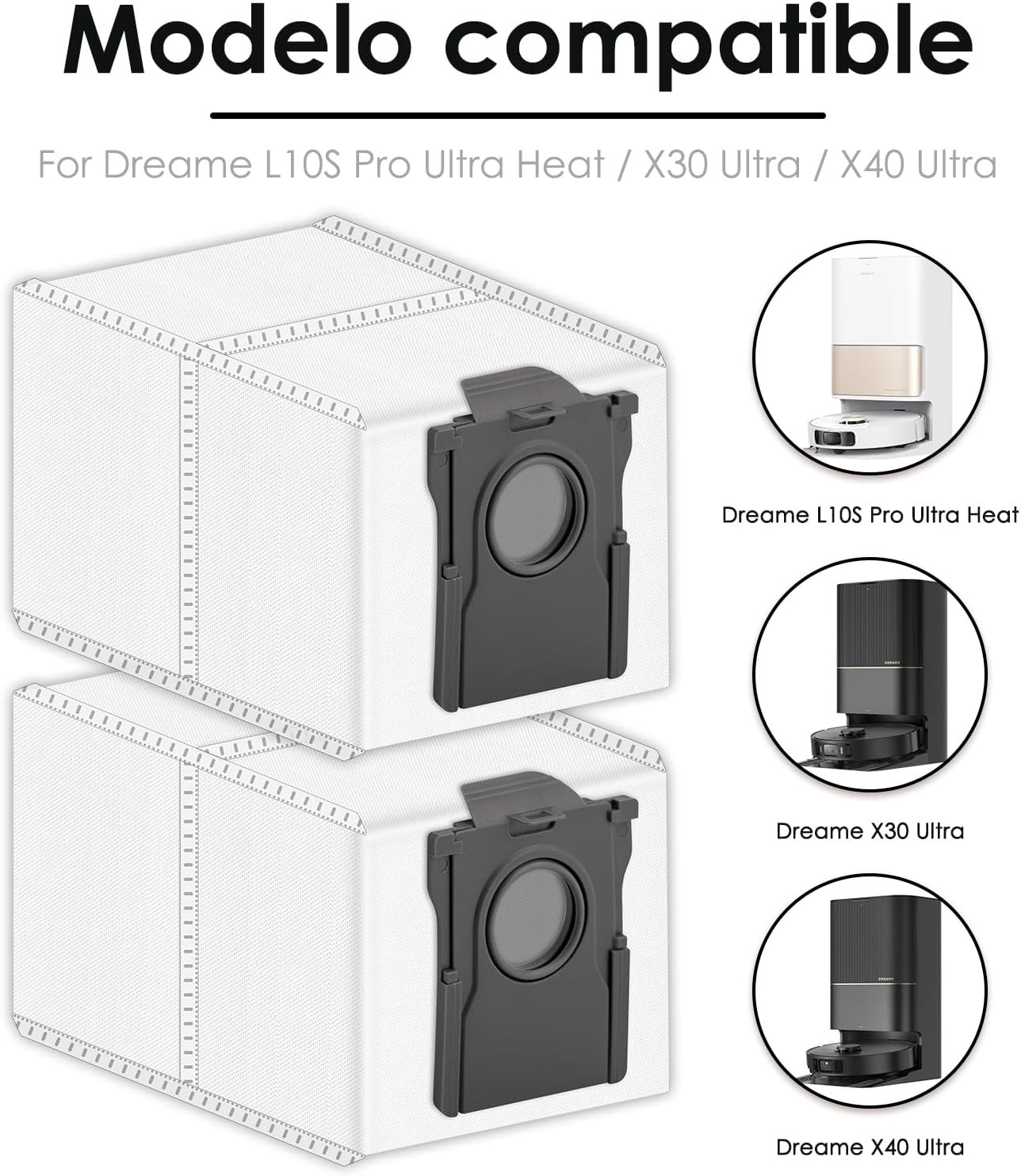 (9 Pack) Replacement Vacuum Dust Bags for Dreame L40 Ultra/ L10s Pro Ultra/ X30 Ultra/ X40 Ultra/ L10s Ultra Gen 2/ X50 Ultra Robot Vacuum Cleaner, Replacement Canister Vacuum Bags About this item 【Perfect Compatibility】 The Replacement Vacuum bags are specially developed for Dreame L40 Ultra/ L10s Pro Ultra/ X30 Ultra/ X40 Ultra/ X50 Ultra/ L10s Ultra Gen 2 . The installation method of the dust bag is the same as the original dust bag, which is easy to install and easy to use. 【Great Value Package】This package will come with 9 pieces of high quality vacuum dust bags. It is a cost-effective choice to supplement the replacement filter bags for your robotic vacuum. 【Powerful Dust Bags】 Unlike the traditional cleaning method, using our dust bag, the garbage and dust can be picked up and disposed easily. Meanwhile, no flying dust and secondary pollution will be caused to the environment and human body. The dust bag can hold your household garbage of several weeks. 【Premium Materials】 The filter bags are made of high quality melt-blown fiber filter layer and non-woven fabrics, which can effectively block dirt, pollen and small dust particles etc. The non-woven fabric can be decomposed within 90 days under natural conditions and will not have any pollution to the environment. All the parts on the dust bag are made of Environmentally friendly materials. 【Newest Upgraded Dust Bags】 The Dust Bags of the latest version are sealed by professional machines, with stronger capabilities to filter up to 99.9% of the dirt, pollen, small dust particles and substances in the air, which allow your family to enjoy cleaner environment and air within the house.