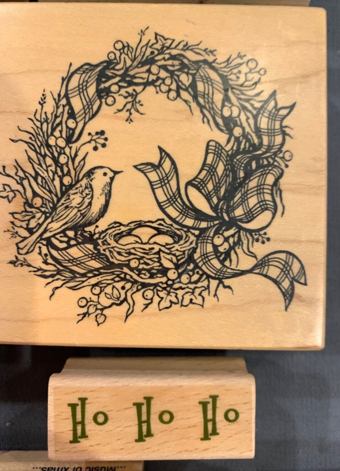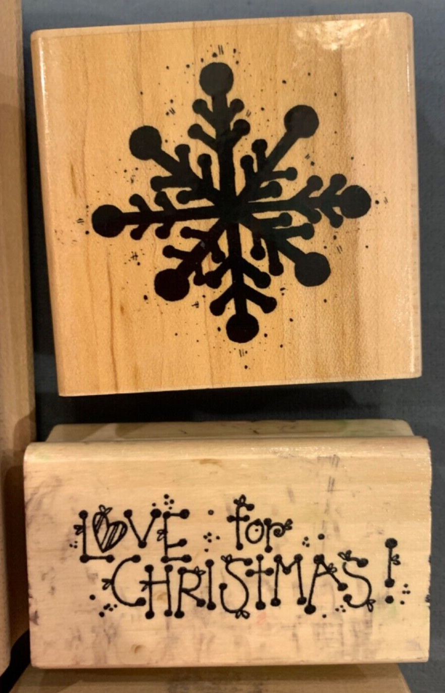 This set of 9 Christmas Holiday wood mounted rubber stamps are perfect for scrapbooking or card making for the holidays. The set includes Christmas trees, Santa, Poinsettias, sayings and greetings.
