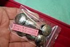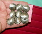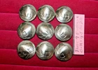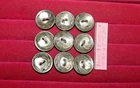 FREE Shipping on this lot of 9 genuine old US Buffalo Nickels hand crafted into domed shank buttons. They are apx 3/4" in diameter. Copper shank securely soldered. They have been cleaned but not buffed. The buttons in the photos are the exact buttons you will receive should you be the buyer. All 9 are "Tails" in this lot and have Buffalo side out. Normal wear from nearly 100 years of use as coins. Buy It Now, 21.50 includes free shipping anywhere in the USA. Please check out my other lots and items including Buffalo Nickel Screw Back Conchos and Rings. Thank You and Good Luck! Rick