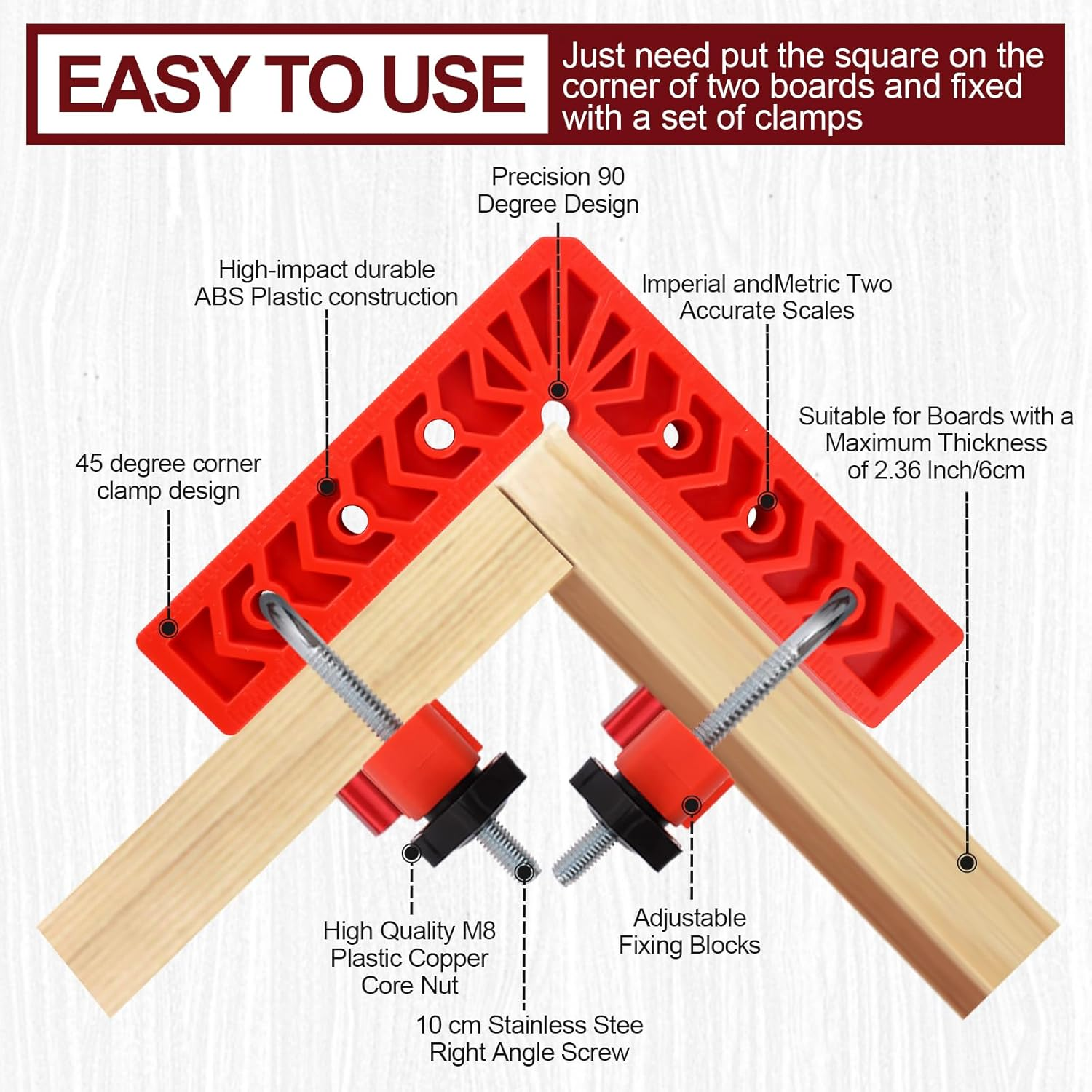 Store New Arrivals Add to Favorite View Feedback Contact Versatile 90 Degree Clamp Set – Essential Woodworking Tools for Pictures Frames, Cabinets, and Boxes (3" 4" 6") with Clamps for Woodworking Description Item model number JC-MGGJ Style Industrial Color Red Brand GemCity Material Plastic Country of Origin China Batteries Required? No Item Weight 2.61 pounds Batteries Included? No Manufacturer GemCity Package Dimensions 10.83 x 6.65 x 2.05 inches Included Components 4PCS 3'' + 4PCS 4'' + 4PCS 6'' + 8PCS 10CM Clamps 【Size and Weight Details】 This set includes 12 sets of 90-degree positioning squares with lengths of 3", 4", and 6", screw length of 4", and a total weight of 3.5 lbs, including wood clamps for woodworking 【Premium Quality】 Crafted from high-quality plastic, these 90-degree positioning squares offer outstanding cost-effectiveness and durability, perfect for wood working 【Efficient Woodworking Tools】 Utilize the 90-degree positioning square with the clamp to effortlessly position wooden boards at right angles for gluing or welding, simplifying your work with woodworking tools and accessories 【Wide Applications】 Professionally assemble boxes, drawers, cabinets, and frames with these right-angle clips designed for versatile use, including corner clamps for woodworking 【Excellent Service】 If you're unsatisfied, contact us anytime for a prompt and satisfactory solution to ensure your contentment with our products. Product Description ABOUT US We offer the best prices around on high quality products. Our E-store includes media such as books, movies, music and games while offering electronics, toys, sporting apparel, clothing, tools, general home, garden items and more. SHIPPING We are always working hard to ensure your package arrives as soon as possible. Please understand that some factors like weather, high postal traffic, and the performance of shipping companies are outside of our control. We offer free shipping to the lower 48 states and ship within 2 business days of payment, usually sooner. We do not accept P.O. Boxes. Please provide a physical address. RETURNS We offer a 30-Day Return Policy on items which you are not completely satisfied with. You have the option for a full-refund or an exchange of the item. No returns are available on items shipped outside of the USA. PAYMENT We accept PayPal. CONTACT US This page content is yet to come Please ad us to your favorite seller and visit again later Thank You CUSTOMER SATISFACTION We try our very best to make sure every customer is completely satisfied. If there's a problem, message us! We're happy to help.