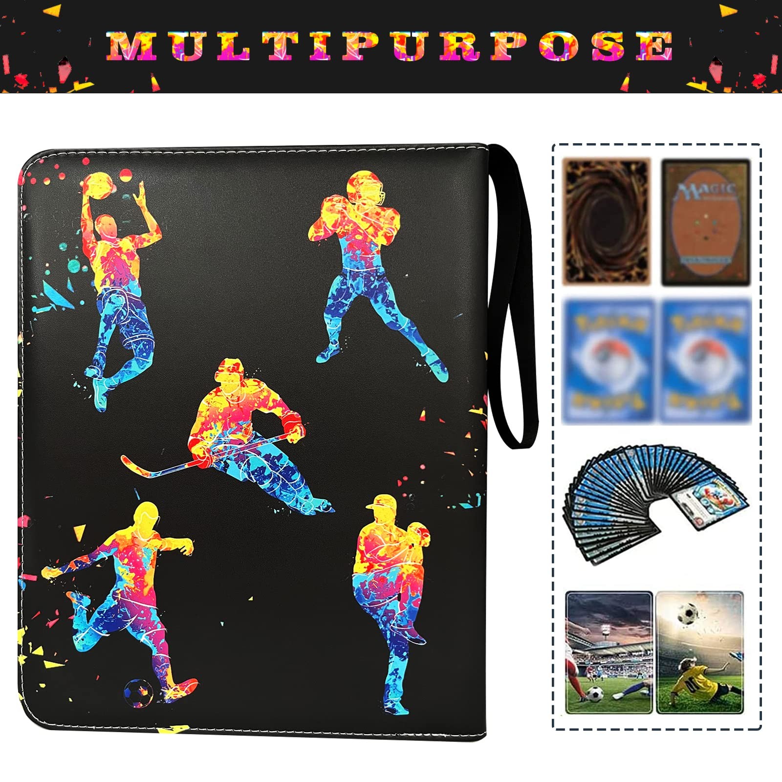 Sports Cards Binder Each page has 9 pockets that hold cards on both sides and includes 50 high-quality removable sleeves that can hold up to 900 cards for trading card games. The three-loop design allows you to add or remove sleeves at will for all your collecting needs.The trading card binder is made of thick PU leather, Water or raindrops won’t seep through. the transparent card sleeves' main material is clear polypropylene, durable quality, Acid Free, waterproof, super sturdy that won't get cards to bend up, protect your card from fading and stain.The waterproof trading card sleeves keep better protection adopt reinforced heat-sealed seams technology. The quality zipper seals the binder so that the inner pages or cards do not fall. The extra wristband design makes it easy for both kids and adults to carry around. 【Storage Capacity】Sports Cards Binder Each page has 9 pockets that hold cards on both sides and includes 50 high-quality removable sleeves that can hold up to 900 cards for trading card games. The three-loop design allows you to add or remove sleeves at will for all your collecting needs. 【Premium Material】The trading card binder is made of thick PU leather, Water or raindrops won’t seep through. the transparent card sleeves' main material is clear polypropylene, durable quality, Acid Free, waterproof, super sturdy that won't get cards to bend up, protect your card from fading and stain. 【Perfect In the Details】The waterproof trading card sleeves keep better protection adopt reinforced heat-sealed seams technology. The quality zipper seals the binder so that the inner pages or cards do not fall. The extra wristband design makes it easy for both kids and adults to carry around. 【Unique gift】Original designs are destined to be unique gifts for boys and girls on this special day. For example, birthday, Christmas, Thanksgiving Make them look special. 【Applicable Card】 Our Game Card Binder is compatible with standard sized cards such as Fuji mini Polaroid photos, Yu-Gi-Oh Card Game, Skylanders, Football Cards, Baseball Cards, MTG Card Game, Dutch Blitz Card Games, etc