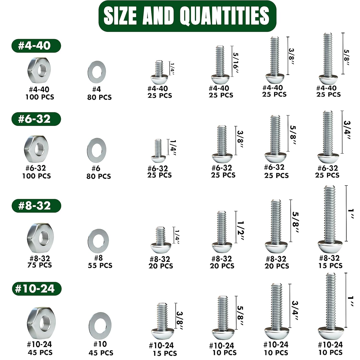 【900 PCS ASSORTED NUTS AND BOLTS】 It includes 16 different sizes of bolts and 4 sizes of nuts and washers each. Bolts: #4-40 x (1/4”,5/16”,3/8”,5/8”), #6-32 x (1/4”,3/8”,5/8”,3/4”), #8-32 x (1/4”,1/2”,5/8”,1”) & #10-24 x (3/8”, 5/8”,3/4”,1”) 【STAINLESS STEEL BOLTS AND NUTS SET】 This bolts and nuts kit is made from standard quality 304 stainless steel material that is long-lasting and highly resistant to rust, corrosion, and rough weather conditions 【SAFE AND CONVENIENT PACKAGING】 All nuts bolts and screws come packaged into a separate zip lock bag with different compartments for each size mentioned on the box. The nut & bolt assortment sets box keeps them separate, organized, and travel friendly 【WIDE APPLICATIONS】 Be it home repairs or DIY this screws and nuts set is a perfect tool for home improvement. It’s perfectly ideal for electronics, wooden work, furniture, vehicles, automobiles, and your favorite DIY projects and tasks 【100% CUSTOMER SATISFACTION】 We offer 24 months money back warranty to ensure satisfaction. Customer service is our top priority so we make sure you get the best from us. Product Description The video showcases the product in use. The video guides you through product setup. The video compares multiple products. The video shows the product being unpacked.