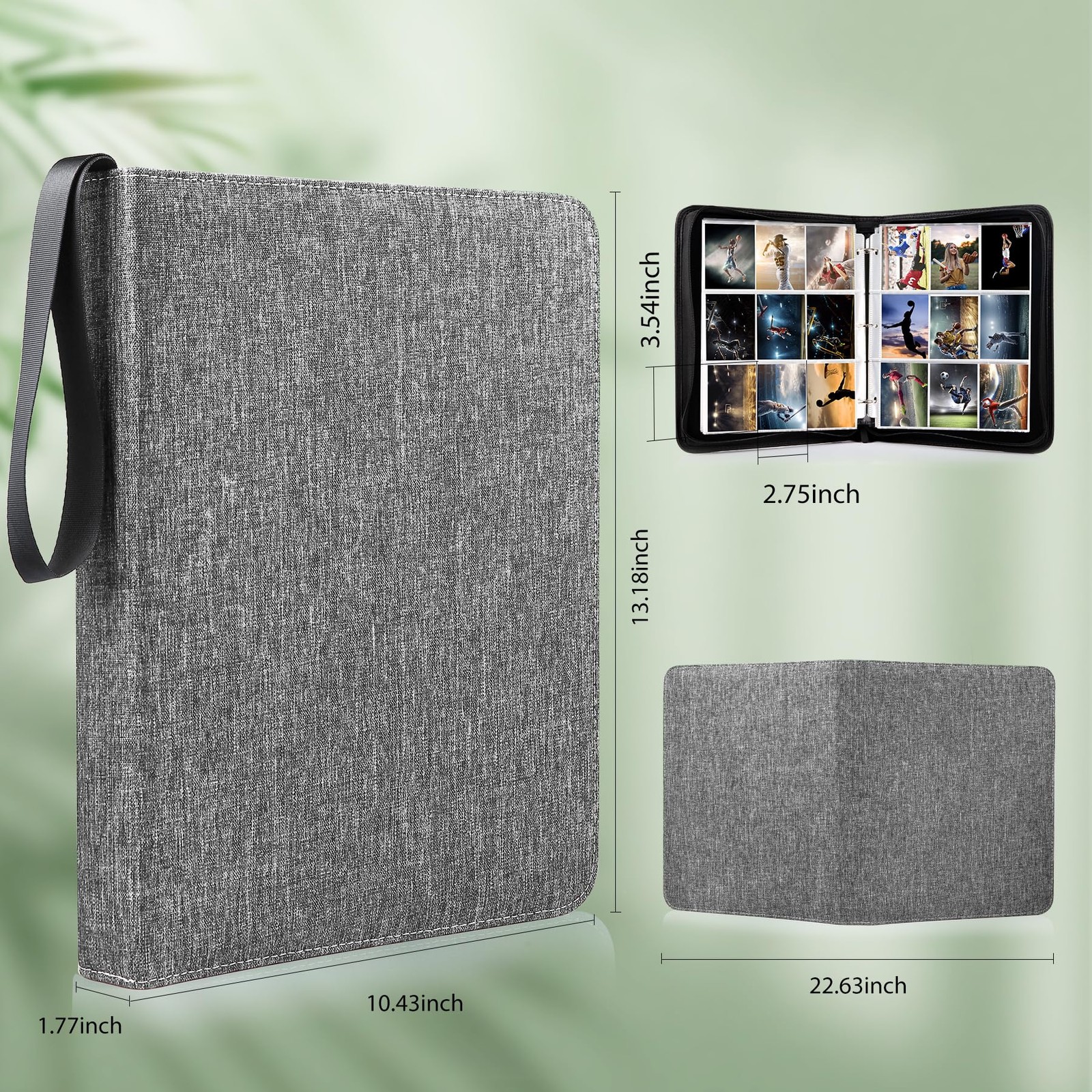 Trading Card Binder, 900 Pockets Collection Card Binder Sleeves with Polyester Fabric Cover&Zipper, Double Sided Pockets Card Holder Carry Card Case for Standard Size Cards - Grey 【Superb Card Binder】 trading card binder is made of waterproof polyester fabric cover, has admirable toughness and is not easy to be torn. The special texture on the surface of card binder shows your high-grade taste and cozy fluffy inner is more attentive to collect your cherished cards. In Addition, the card sleeves made of ultra-clear non-PVC polypropylene is durable and acid-free, which is great to keep card from fading and stains. Precious gifts for kids or friends to collect cards. 【900 Pockets Storage Space】 9-pockets card binder comes with 900 card pockets, including 50 removable card sleeves(double-side pocket). it will hold and protect more of your valuable and cherished cards. With size of 3.6x2.7in, each pocket hold up to 2 1/2 x 3 1/2 cards and other standard cards, ensures your favorite cards securely stored and neatly organized. 【Full Protections】 Top-loading design of card sleeves are conducive for card insertion and prevent your cards from falling or beverage infiltration. Smooth zipper benefits to zip up or expand, again preventing card from slip off and protecting privacy. Thoughtful Details. 【Great Portability】Portable wristband supports you to take the card binder wherever you need. You can take the card binder to school or friends' homes to share your favorite cards with your good friends or classmates at any time. Portable for carrying. 【Wide Applications】 Trading card sleeves fit for all standard sized trading cards such as, Football Cards, Baseball Cards, Basketball Cards, Playing Cards, Gaming Cards, MTG cards, 3 inch photos, coupons, business cards, credit cards, gift cards or other cards etc. Great for card storage and display.