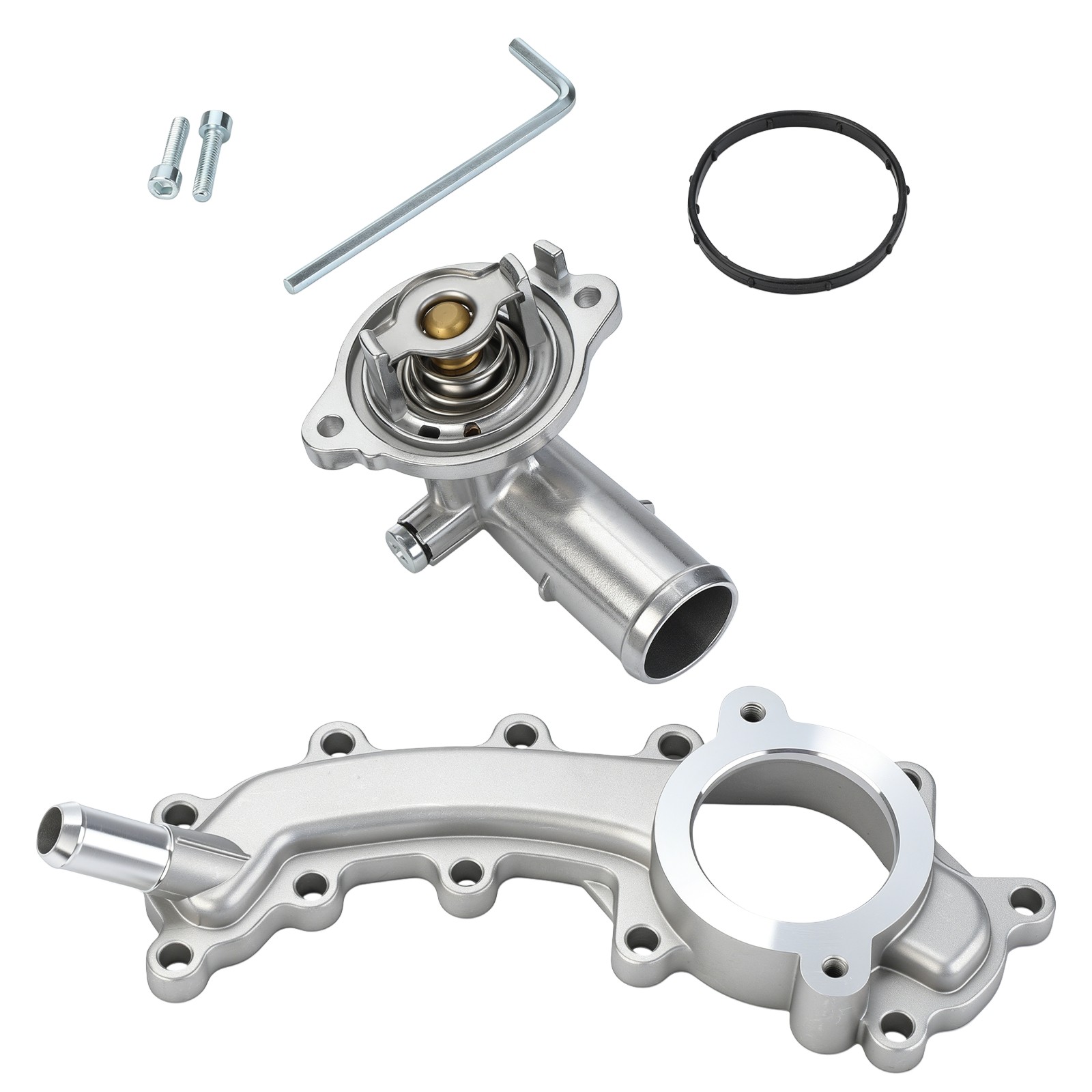 Product Description EASY INSTALLATION & LEAK-PROOF DESIGN: The temperature control housing assembly in the kit has a plug-and-play design, which provides easy installation for a leak-free cooling system and reduces engine wear. This design allows for easy replacement of G.enuine parts for a more reliable cooling system Manufacturer Part Number:Aluminum Coolant Crossover Water Outlet Replace Part# 5184653AF, 5184653AD, 5184653AE:Compatible with Dodge Durango 2011-2015,Jeep Grand Cherokee 2011-2020 HIGH QUALITY ALUMINUM MATERIAL: This kit are made of high quality aluminum alloy material, which provides excellent durability and reliability and is more durable than the previous plastic material DURABLE MATERIAL: The engine coolant crossover pipe and engine coolant thermostat housing assembly in the kit are made of high-quality aluminum alloy material, which is not easy to break or deform, and is more durable than the previous plastic material in terms of service life. They can be firmly connected to the corresponding pipes and remain stable in the engine compartment environment to ensure smooth use PROTECT THE ENGINE: Replacing old or cracked engine crossover water outlet aluminium Pipe protects the engine and ensures a smooth driving experience by ensuring the proper amount of coolant passes through the engine while driving. This helps prevent engine overheating, check engine lights coming on, and breakdowns caused by improper engine temperature regulation