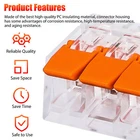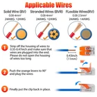 Product Feature ✨--All kinds of standard test probes can be used to check the lever nut. ✨--Don't need any tools to connect wires, just using your hands. ✨--There is a test hole at the back of the lever nut and the hole are designed to check whether the wires have electricity or not. ✨--You don't need to worry about a twist between the wires when you combine the wires. These lever nuts are safer than other methods for connecting wires due to use PC insulating material. ✨--Transparent and good quality cover, which can make you check the wire length, complete wire insertion through its transparent cover. It is convenient to confirm whether the wires plug the jack or not. How To Use 1.Open the housing of wire to 0.35-0.47in 2.Push the orange levers to 90° and insert the wires 3.Three is a test hole on the back of the connector 4.Replacing wires method.Push the operating levers to pull the wires out Product Specification Type Compact Wire Connector Material PC Rated Voltage 250V Rated Current 32A Cable Range 0.14-4.0mm² Stripping Lenth 10mm/0.39inch AWG 24-12 Quantity 90PCS Package Included 🎁2 Port,A221-412 (45pcs) 🎁3 Port,A221-413 (30pcs) 🎁5 Port,A221-415 (15pcs) On Feb 22, 2024 at 22:13:55 PST, seller added the following information: