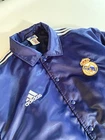 Vintage 90s Adidas x Real Madrid Bomberjacket • Extremely rare edition • 1999 model with 'perfect fit' • High collar, wide sleeves, tight cuffs & waist • Embroidered logos on chest • Three stripes stitched on sleeves • Great condition, small flaw on back shoulder • Label size: 'large' - fits perfect for L / XL _________________________________________ #firebird #giacca #camisa #football #jersey #boxy #oversized #deadstock