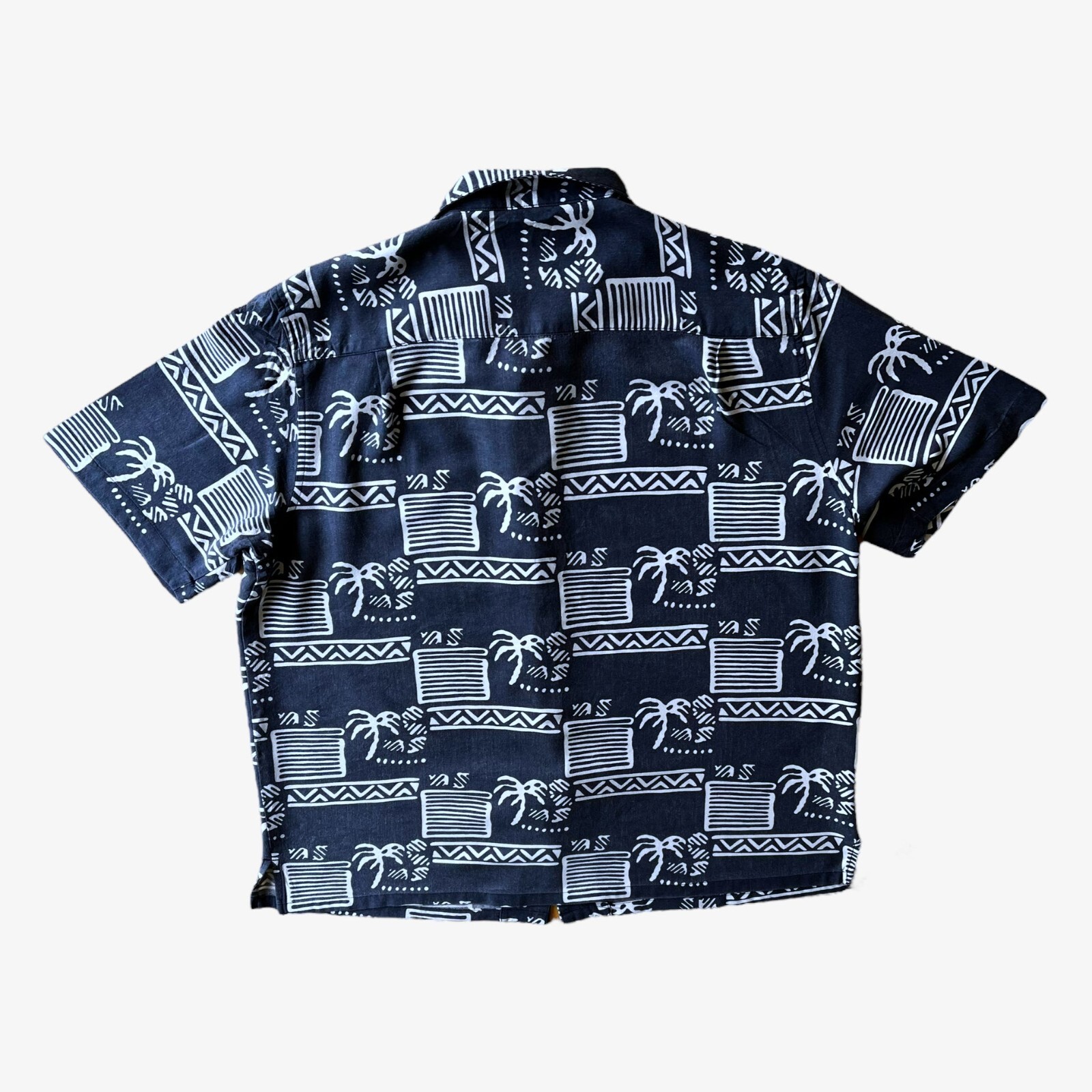£20 On Casspio’s Dream Vintage Vintage 90s Men's Island Republic Palm Tree Print Short Sleeve Navy Silk Blend Hawaiian Shirt. 55% Silk - 45% Rayon Retro Colourful Lightweight Size Label: L Our Size: L Measurements: Pit to pit: 23.25 inches Nape of neck to hem: 28.5 inches Condition: Good. Signs Of Wear Around The Item.