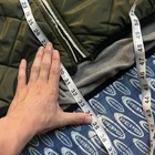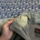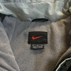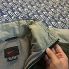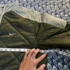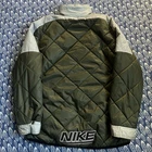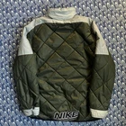 The product is a vintage 90s Nike men's quilted full zip outerwear jacket in gray and green. It features a puffer style design with a full zip closure and quilted accents, making it a stylish and functional addition to any wardrobe. Made of nylon, this jacket is durable and perfect for outdoor activities or casual wear. With its retro 90s theme and classic Nike branding, this jacket combines both fashion and functionality for a timeless look. Measurements: Sleeve length: Jacket has stain marking around cuffs, collar, and back thread is undone.