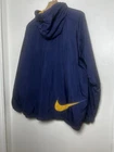 Vintage 90s Nike Spellout Swoosh Wrap Around Zip Up Puffer Jacket Embroidered Excellent Gently Preloved Condition Very Cool Embroidered Swoosh that wraps around the side to the back of the jacket Very High Quality Has Full Zipper, Pockets, Hooded with drawstring Tagged XL Measures 25 in pit to pit 30 in length This is a vintage 90s Nike puffer jacket for men in size XL. Made of blue nylon with embroidered wrap-around Swoosh spellout pattern. Features a hood, full zip closure, pockets, and is suitable for all seasons. The jacket has a mid-length fit and is insulated with polyester. It has a retro 90s style and is perfect for casual occasions in winter, fall, or spring.
