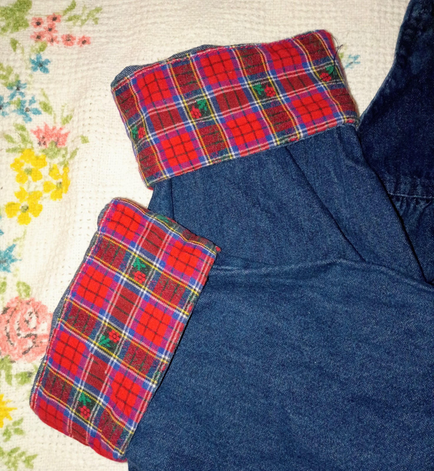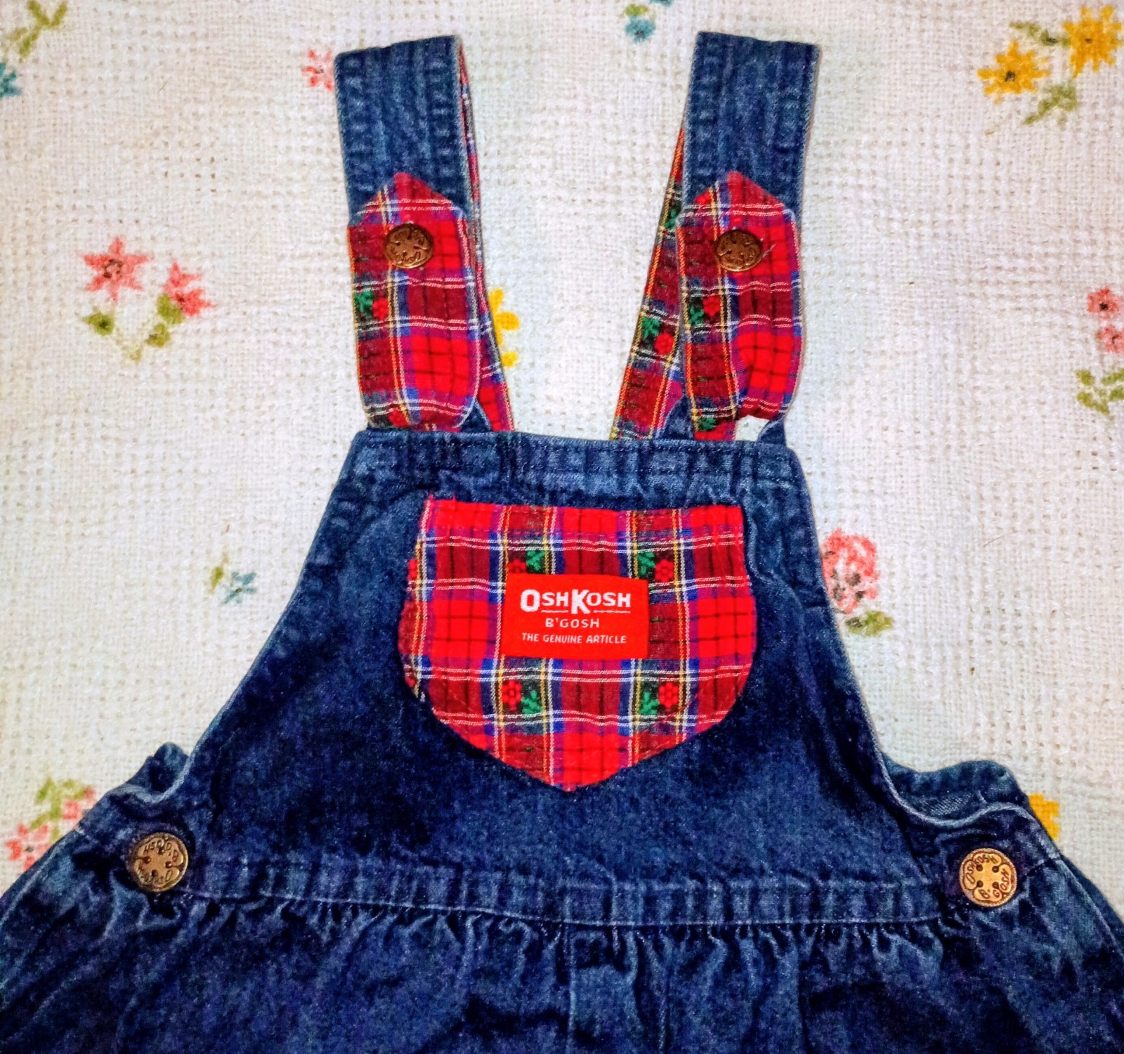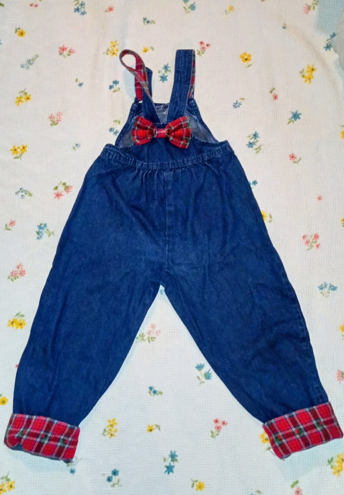 90s Vintage Oshkosh B'Gosh Blue Denim Overalls Girls Sz 6 Bow Red Plaid