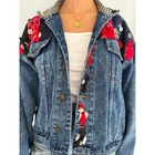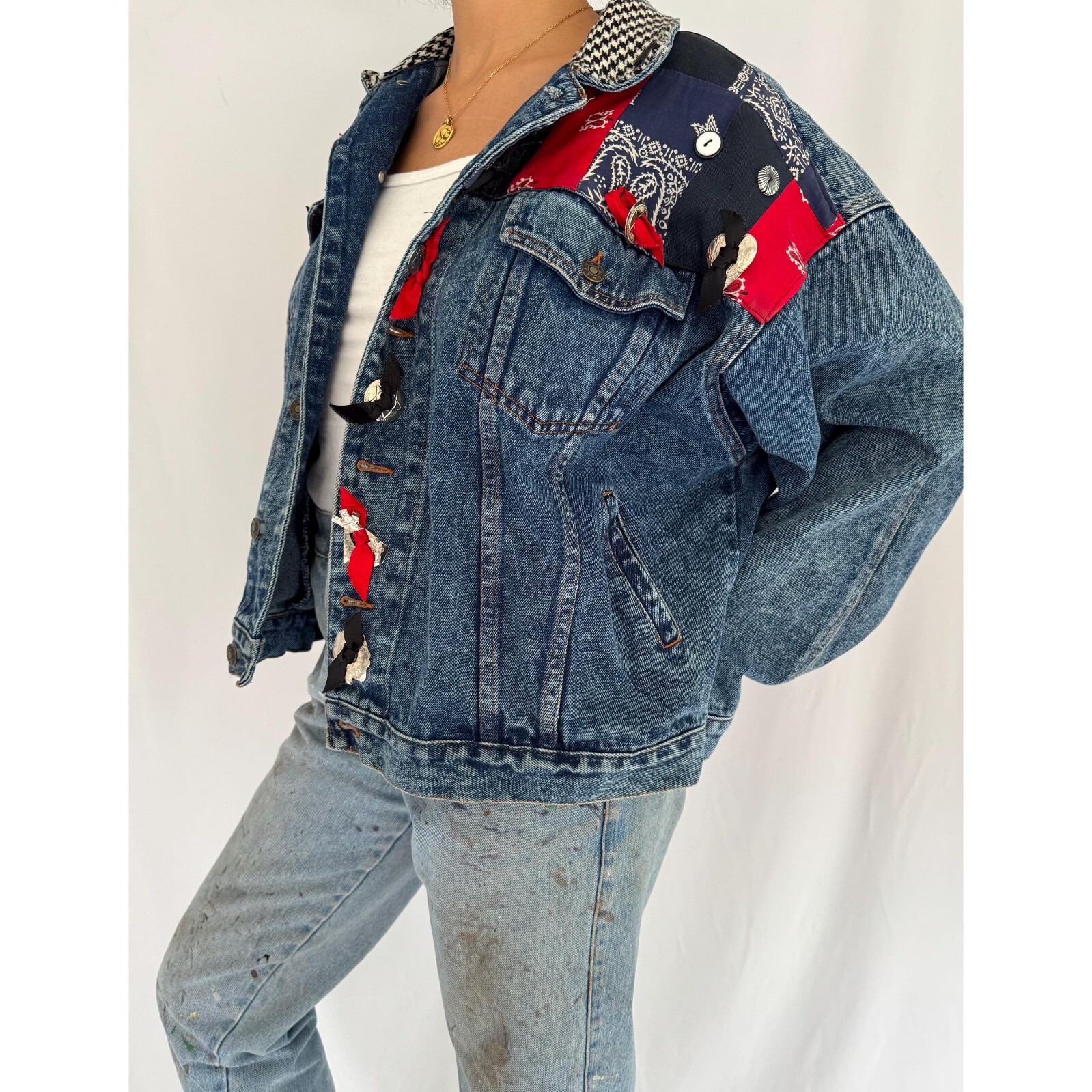this fantastic heavy denim jacket from the 90s is giving major rodeo western vibes! the vintage jacket is super unique with its mixed fabrics bandana patchwork embroideries in shades of navy blue, red and black, and its houndstooth patterned collar in shades of cream and black. I also love the numerous buttons and silver medallions accented with black and red ribbons throughout! the collared jacket features a six front button closure, long sleeves with a button on each sleeve cuff, and four pockets (two button flap chest pockets and two slash waist pockets). there are two button adjustable cinching flaps on both sides of the back waistband. the jacket is made of a heavyweight, sturdy medium blue wash denim (100% cotton) with a bit of an acid wash, and contrast yellow/gold stitching. the jacket has a boxy and oversized fit, and is unlined. this super cool piece that would be great to wear in all seasons and is in excellent vintage condition, besides some very light staining at the front and light runs in the fabric patchwork. tagged as size medium and I would say this best fits womens size medium (for baggy oversized look) or large. measurements (lying flat): shoulder seam to shoulder seam: 23” across bust (pit to pit): 23” across sleeve length: 20” centre back length (without collar): 20”