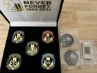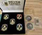 This lot consists of beautiful new set of 6 coins/pins honoring various civil services that gave it all EMS, Police, Fire Department, and K9. The set is displayed in a case and was issued in 2004 in remembrance of the 20th anniversary of that tragic day. Also included in this lot are 2 additional remembrance coins, NY Fire Department, commemorating the 19th and 20th anniversaries. Lastly, this lot contains a (previously owned) money clip in remembrance of the American flag being raised by 9/11 heroes.