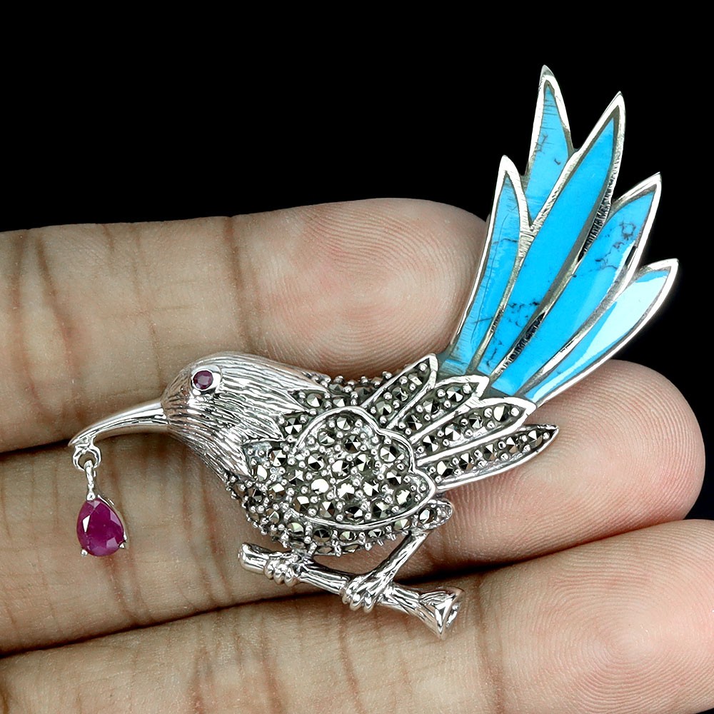 Absolutely stunning craftsmanship! The vibrant ruby and turquoise pop against the silver, and the marcasite adds such elegant sparkle. It's surprisingly lightweight yet feels substantial and well-made. This piece instantly elevates any outfit and has become my favorite accessory.