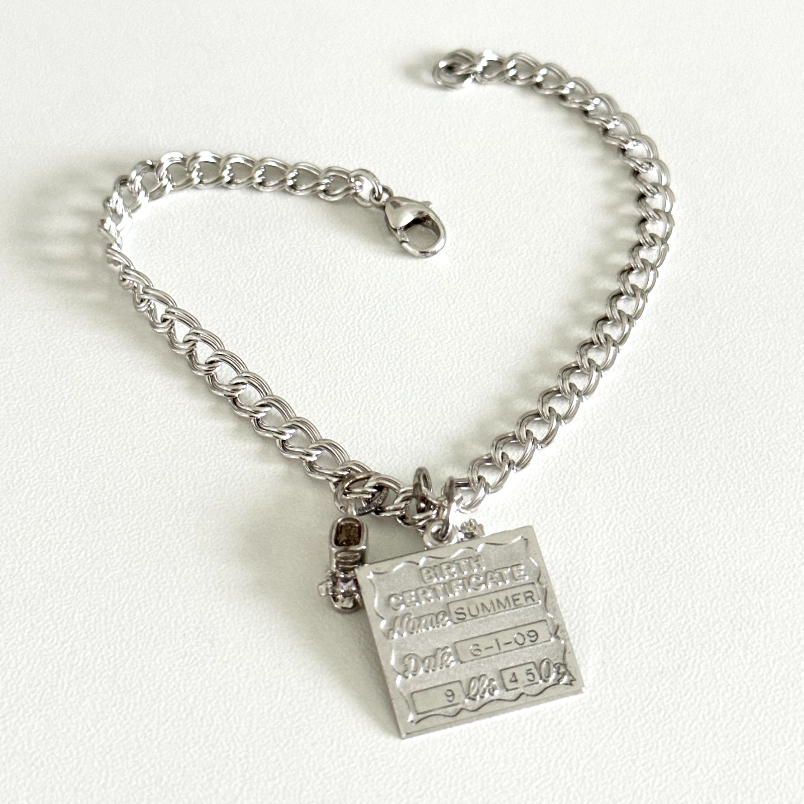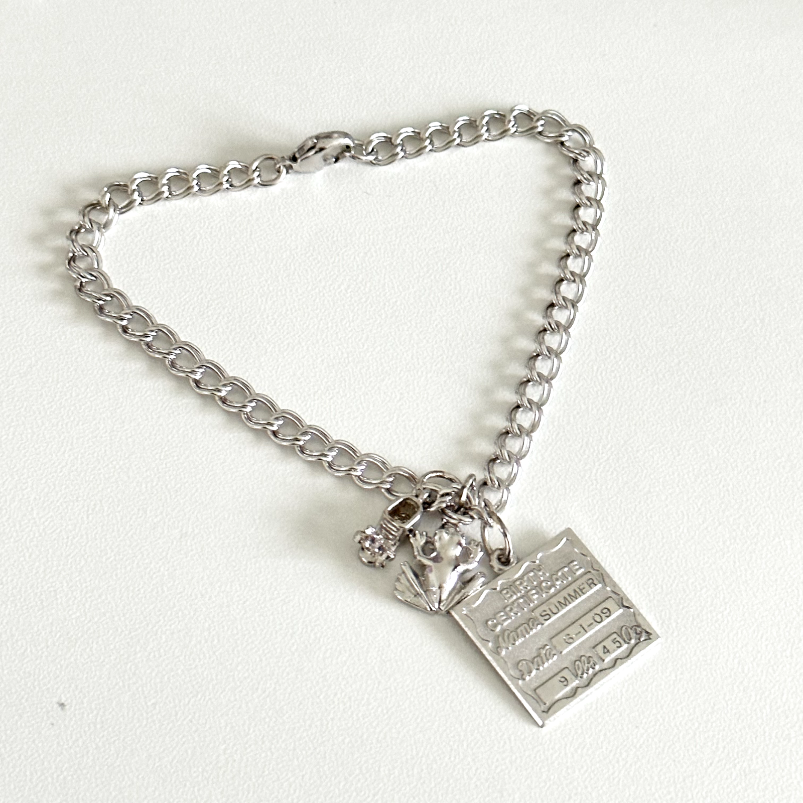 925 Sterling Silver Vintage 3 Charms Curb Chain Link Bracelet Lovely vintage charm bracelet features a frog, shoe, and birth certificate charm all on a curb link bracelet, all set in sterling silver. Length: 7.75" Width: 5mm Weight: 10.7 grams Signed for sterling silver. Very good vintage condition. - Fast shipping, I ship the same or next business day! I also combine shipping. - Thank you so much for shopping with me and please check out my other jewelry listings, I post new pieces daily !