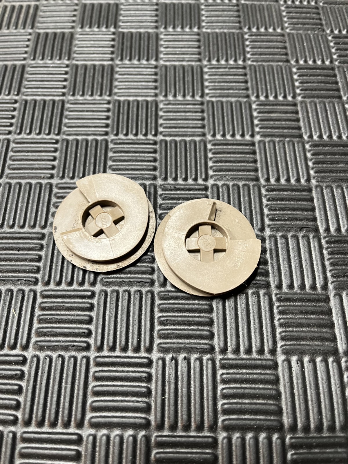 93-02 Camaro Firebird Beige Tan Seat Belt Buckle Mounting Bolt Covers PAIR. One cover has a small crack.