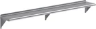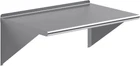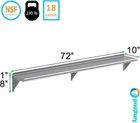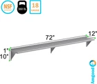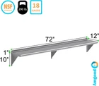 About this item Metal This heavy-duty multifunctional stainless wall shelf is made with 18 gauge stainless steel and can hold up to 360 lbs of weight. The design features a 1" backsplash and bullnose edge. It's made with durable welded corners and support brackets. Its professional, modern and sleek design makes this metal floating shelf perfect for use in any residential or commercial kitchen, food truck, garage, closet, laundry room, utility and equipment room, lab, appliance shelf for toaster and microwave, etc. NSF certified to meet the strictest standards for public health protection. The industrial-quality manufacturing process meets the highest regulatory requirements for construction, safety, and durability. This corrosion-resistant wall mount shelf can handle anything you throw at it and will last for years to come. Easy to clean and sterilize, metal shelves are superior to wood or glass. Food and liquid won’t get stuck or ruin the integrity of the surface. Easily wipe away excess with no fuss, mess, or contamination. The shelf ships knocked down. Brackets, hardware, and installation manual are included. Installation takes less than 15 minutes.