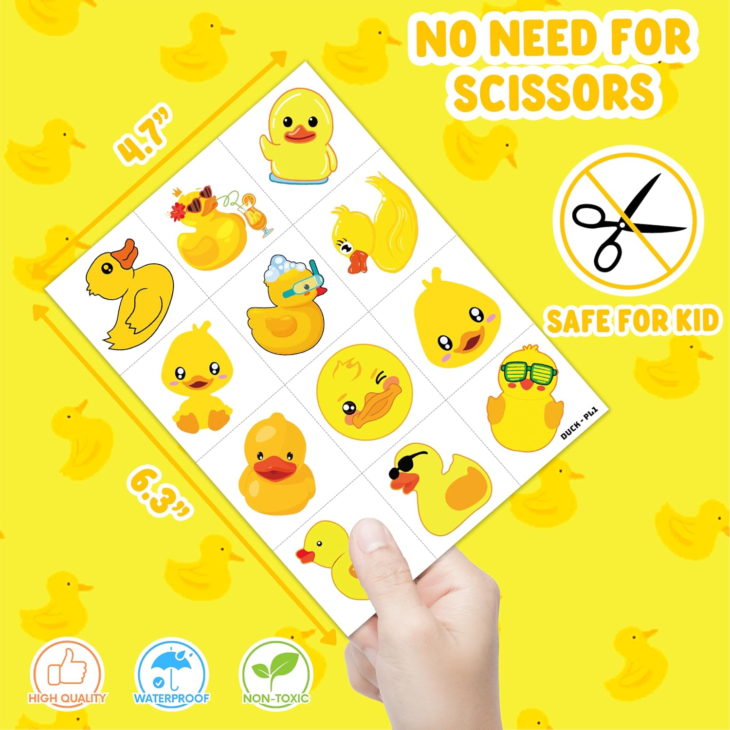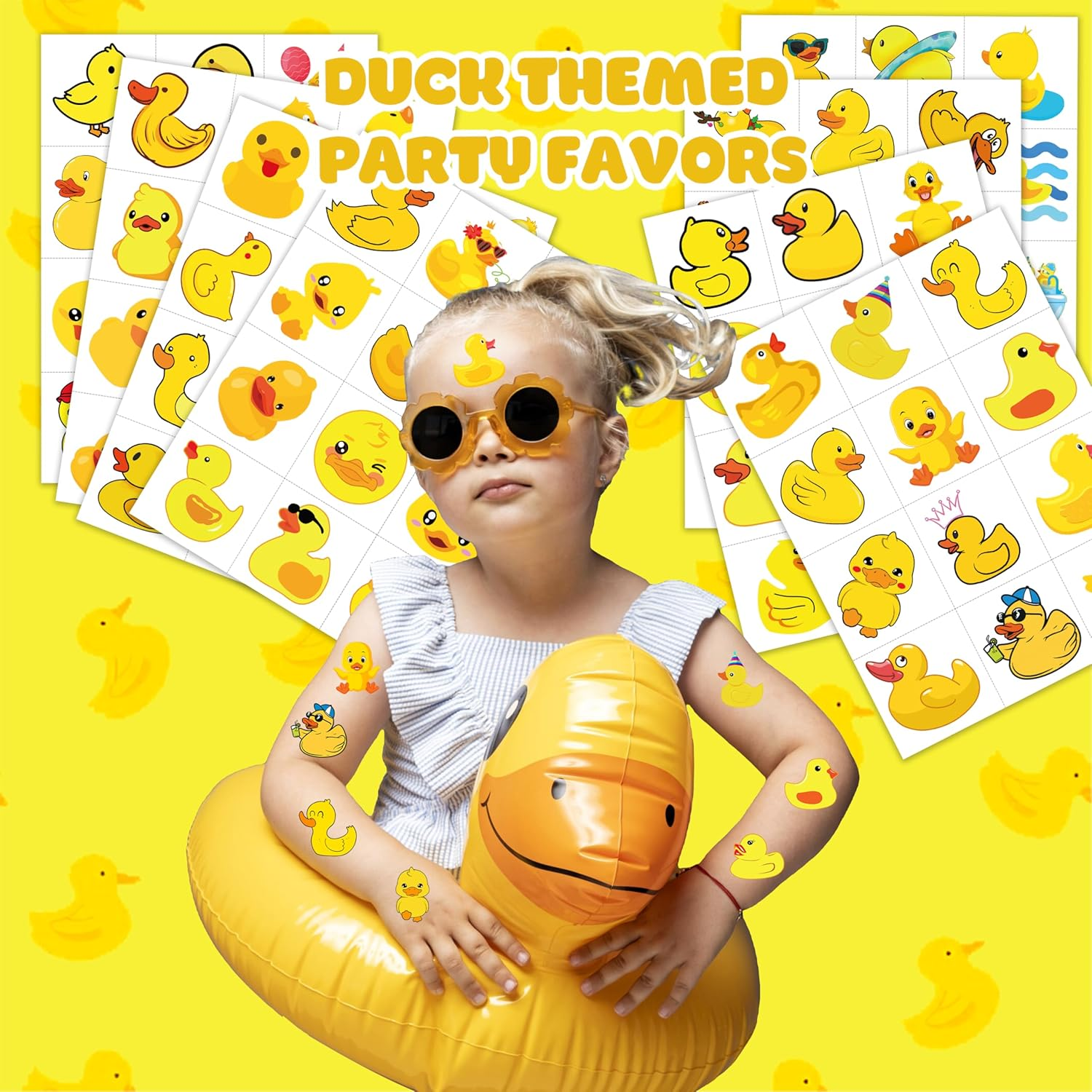 96 PCS Rubber Duck Pre-Cut Temporary Tattoos Themed Birthday Party Decorations Supplies Favors Decor Little Yellow Ducky Tattoo Stickers Gifts for Game Boys Girls Classroom School Prizes Pattern rich: Rubber Duck Cute Little Yellow Ducky Temporary Tattoos include 8 Sheets 96 PCS, the size of each sheet is 6.3 * 4.7 inches. Easy to share,even if a lot of people's parties, you can have a different tattoo with others.These adorable tattoos will keep you and your little ones – and their friends – occupied for a while. Widely used: Rubber Duck Cute Little Yellow Ducky Temporary Tattoos pieces are suitable for many occasions such as birthday party supplies, party decorations, party favors, party bags, DIY decorations, pool and the beach or gift .Temporary tattoos are the best party favors and goodie bags fillers ever for any kind of celebration! Easy to Use & Remove: Choose the pattern you like, and then face down on skin, wet the temp tattoo with water and wait for 10 seconds. Then gently tear off the white surface. You will get a tattoo. Removes with baby oil, or makeup remover. Please wipe gently to avoid skin abrasions. Safety Material: Temporary tattoos are a painless, and convenient way to express yourself. Durable & Long lastin:Temporary tattoos will not come off easily and stay 1-3 days or more. Not recommended for people with a history of sensitive skin, if symptoms appear, stop using immediately. Product Description Eye-Catching Duck Tattoos Celebrate the charm and playfulness of ducks with a unique duck-themed tattoo! Whether you’re drawn to their quirkiness, beauty, or symbolism, a duck tattoo can add a fun and whimsical touch to your style. From realistic depictions of ducks in natural settings to creative and abstract designs, these tattoos can represent qualities like adaptability, freedom, and new beginnings. Whether you opt for a simple silhouette or a detailed, colorful design, a duck tattoo is perfect for animal lovers or anyone with a love for nature. Let your tattoo float through life with a design that’s as joyful and free-spirited as a duck! Dimensions 3.1 inches x 6.0 inches x 0.09 inches. Weight: 0.81 oz Specifications Color Yellow Country of Origin China Water Resistance Level Water Resistant Pattern Cartoon Package Dimensions 6 x 3.1 x 0.09 inches; 0.81 ounces Number of Pieces 100 Shipping: Shipped from the USA. Fast delivery within 2–3 days. Payment: PayPal, credit card, bank transfer. Returns: 30-day free return – we cover the shipping cost. Quality: Made in Europe/USA/China. No customs fees. VAT invoice on request. Feedback: You’ll automatically receive positive feedback after payment.