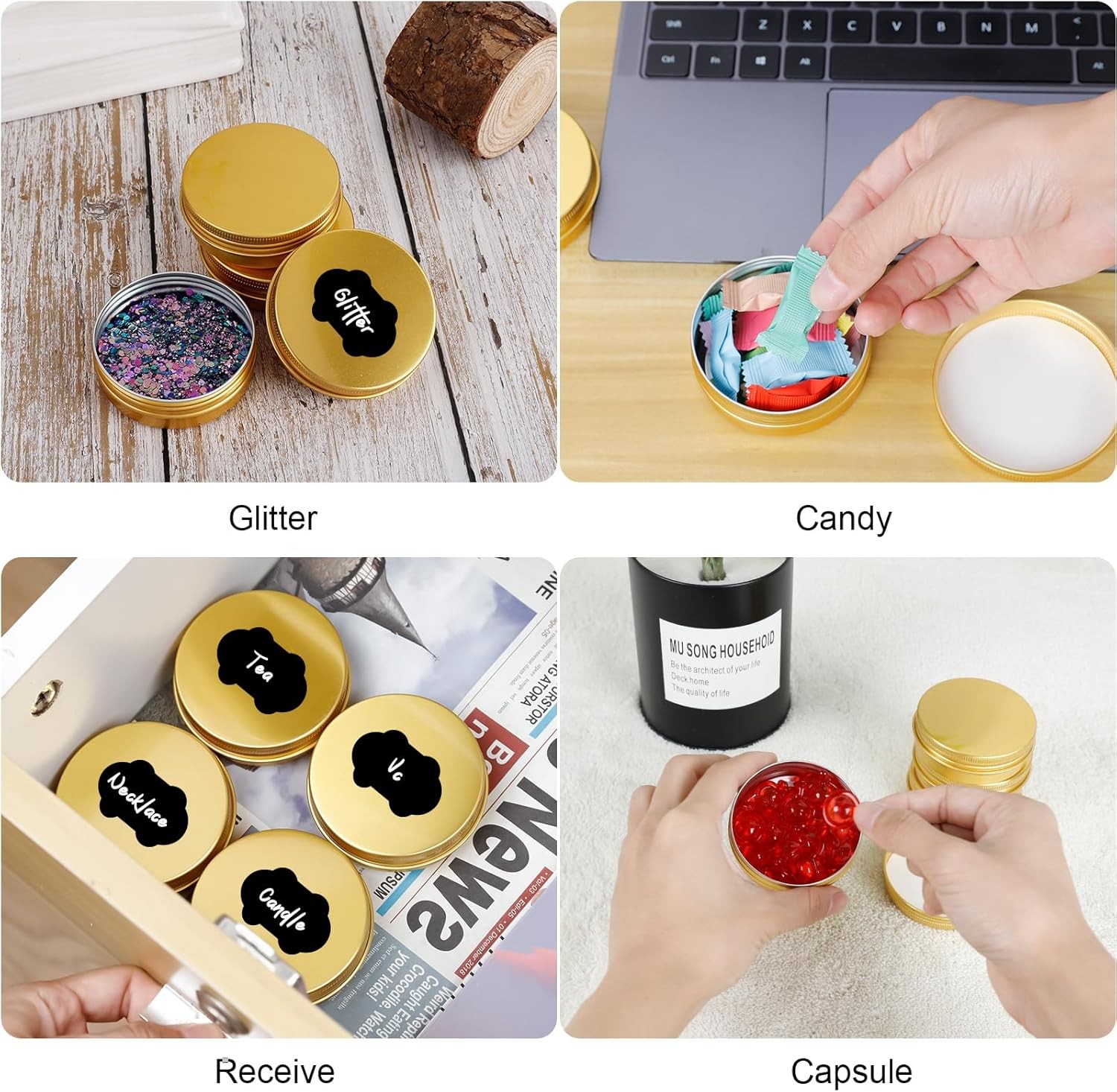 About this item 【Package Contains】96 aluminum tin cans with screw lids,4 pieces of white markers, 108 pieces of black labels 【Capacity】Stores up to 2oz/60ml 【Premium & Safe Material】Made of high-quality metal aluminum, the tin can is beautiful in shape, light in weight yet durable, Smooth surface ,can be labeled with small labels for easy identification. 【Sealing and Leak-Proof】The metal aluminum tin can adopts a tightly sealed screw twist lid structure, it can prevent liquid from leaking efficiently.The best gift for your friends or family who love making jars or cosmetics by themselves. 【Wide Application】- These empty aluminum containers are perfect be widely used to make candles or store DIY ointments, food storage, beard balms,DIY balm, cosmetic packaging, candy storage, and so on. Brand: Color: gold Material: Aluminum Material Feature: Food Grade Capacity: 2 ounces