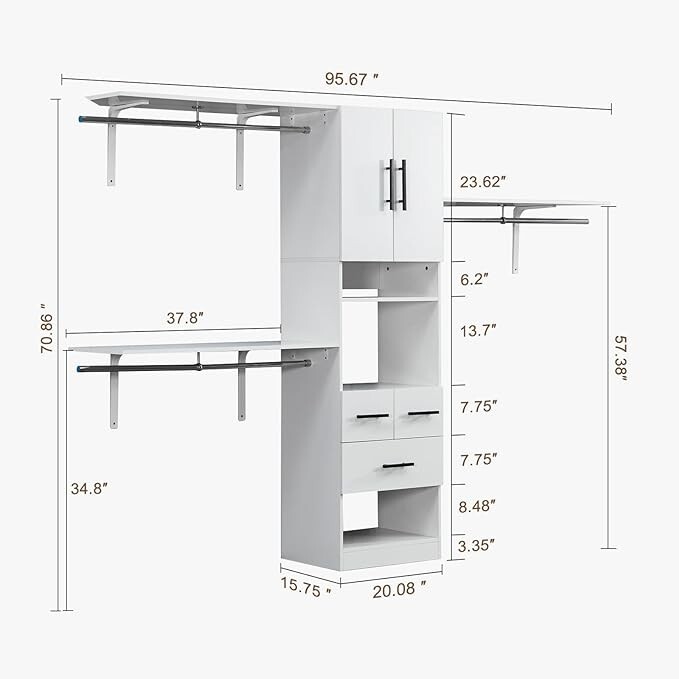 All In One Closet Organizer System: Load capacity over 1,000 lbs, storing 300-350 summer clothes easily. This is a heavy-duty storage solution that can handle even the heaviest loads. In addition, its sturdy packaging ensures safe delivery and protection from damage. Large Capacity Home Organization : This 96" Wood closet organizer includes 1 closet system with door(Upgraded), 3 shelves, 3 hanging rods, 3 drawers, which can be used to store shirts, pants, jackets, sweaters, long skirts, shoes, decorative items or other items in your closet space, maximizing storage capacity while saving space. DIY Closet System: Closet system with extendable hanging rods and removable shelves, you can install this walk-in closet into your custom closet closet system. It can accommodate closets from 5 ft to 8 ft wide. You can install it on one side only and it can be used in a closet system for smaller closets. Safe Design: Unlike metal hangers, this closet is built to last. We use higher quality wood panels and fittings, its sturdy structure ensures that it won't shake or collapse, and the wall-mounted design prevents accidental tipping and ensures maximum safety. professional after-sales team: Our closet systems feature a simplified design for effortless installation. We provide detailed manuals that guide you step-by-step through the process. We also have a professional after-sales phone support team.