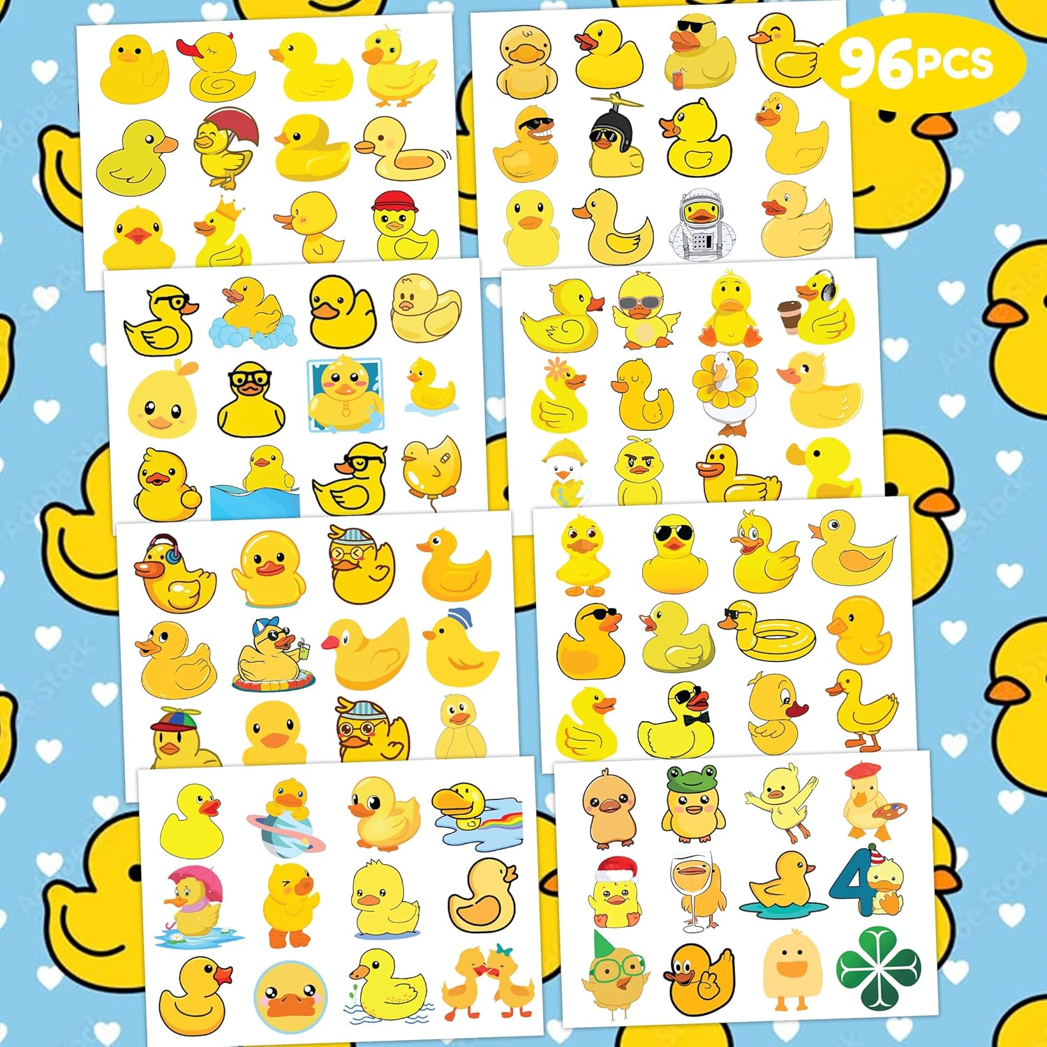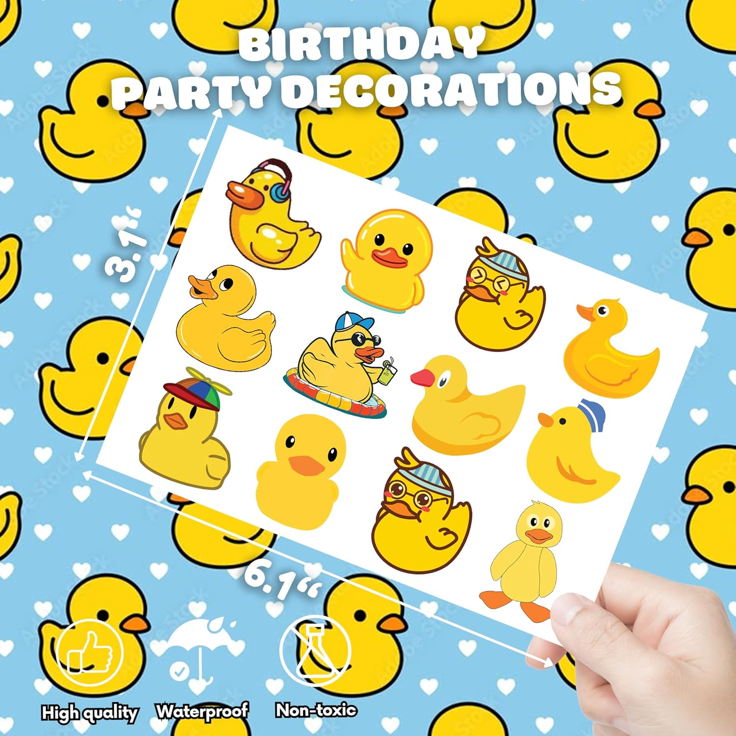 8 Sheets (96PCS) Rubber Duck Temporary Tattoos – Baby Shower & Birthday Party Decorations, Cute Duck Themed Supplies, Stickers, Favors for Kids Girls Boys Classroom Prizes 💛DUCK BIRTHDAY PARTY SUPPLIES: DUCK temporary tattoos will accommodate the orders that children all over the world expect to have them at birthday party, party decorations, and special celebrations. Each tattoos set covers 8 sheets in total with 96 Pcs.The dimension of each sheet is 6.1*3.1 inches, including tattoo pieces that have proportions reasonable for adults to kids. The DUCK tattoos designed to yellow main color promising to develop the cute beauty for party ^^ 💛DUCK PARTY DECORATIONS: DUCK tattoos stickers have obtained the idea from barnyard birthday theme with the typical appearance of lovely farm animals. One of the children’s favorite animals is that Rubber DUCK temporary tattoos featuring stunning color with extremely cute shapes of DUCK ^^ 💛SAFE AND HIGH QUALITY: Our temporary tattoos are made of environmentally friendly materials, and non-toxic, These tattoos are made of high-quality safety and green paper 💛USAGE: Cut each tattoo out of the sheet and remove the piece of transparent paper. Next, wet it with water and wait for about 20-30 seconds, then remove the backing paper thoroughly. As a result, you have a velvety tattoo as we say. You can stick it on your hands, face, arms, or wherever you feel safe. Moreover, you can put it down on the glass, suitcase, luggage, water botttle, laptop, case, etc. As it is a temporary tattoo, you can remove it easily by using water, soap, and hand sanitizer 💛SATISFACTORY SERVICE: Not recommended for people with a history of sensitive skin. If symptoms appear, stop using immediately.Anyway, if you have difficulty using our product, contact us. We will make sure to solve problems and help you have a fantastic buying experience 💛Duck Temporary Tattoos – Adorable & Quirky Designs for Farm Parties, Baby Showers & Animal-Loving Kids! Waddle into fun with these Duck Temporary Tattoos, featuring charming designs like cute yellow ducklings, splashing water, pond scenes, and playful expressions. Perfect for farm-themed parties, preschool rewards, Easter baskets, or animal-themed celebrations, these tattoos add a cheerful and lighthearted touch. Made with skin-safe, non-toxic materials, they’re easy to apply, waterproof, and long-lasting. Whether you're planning a quacky party or just love ducks, these tattoos are sure to delight! Dimensions 3.07 inches x 4.45 inches x 2.24 inches. Weight: 0.63 oz Specifications Style Rubber Duck Themed Color yellow Water Resistance Level Water Resistant Size One Size Package Dimensions 4.45 x 3.07 x 2.24 inches; 0.63 ounces Shipping: Shipped from the USA. Fast delivery within 2–3 days. Payment: PayPal, credit card, bank transfer. Returns: 30-day free return – we cover the shipping cost. Quality: Made in Europe/USA/China. No customs fees. VAT invoice on request. Feedback: You’ll automatically receive positive feedback after payment.