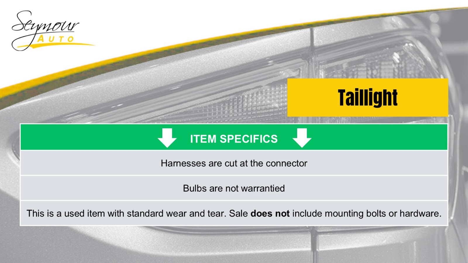 Hollander Welcome to our eBay store! Driver Tail Light Lid Mounted Nal Manufacturer Fits 97-99 CAMRY 1159864 Description This is a Used Taillight removed from a salvage vehicle. This is sold as the Taillight Assembly only. It does not include the plug, bulb, or harness. If these items are left on, they are from convenience only and not covered by our warranty. You are covered by our 6 Month Part Warranty. LEFT IS DRIVERS SIDE AND RIGHT IS THE PASSENGERS SIDE. This taillight has been inspected and is functional, however it may have slight scuffs, scratches, or blemishes. Please contact us with any questions your may have! Donor Vehicle Model : CAMRY Year : 1999 Mileage : 0 (0 = not available or unknown) Stock Number : 028149 Notes : LID This Part Will Fit These Makes And Models With These Options CAMRY 97-99 lid mounted, Nal manufacturer About Us Payment Shipping Returns Warranty About Us We are a locally owned business with over 70 years of experience in the automotive industry with an extensive collection of used car parts and accessories for thousands of different vehicles. Our knowledgeable and caring staff work hard every day making sure all of our parts are high quality and functional to fit your needs. We are happy to verify fitment for you prior to purchase via your vehicle’s VIN (Vehicle Identification Number). Please contact us with any questions prior to purchasing. Orders are sent to the shipping department throughout the day therefore we cannot guarantee adjustments to orders after payment is received. Payment Payment details: Please contact us with any questions prior to purchasing. Orders are sent to the shipping department throughout the day therefore we cannot guarantee adjustments to orders after payment is received. All orders must be paid in full prior to shipment. Payments are processed through eBay by eBay. If payment is not received within a reasonable time from when the order is placed, it will be cancelled without notice. All purchase prices are final. No price match or discount can be made while an item is awaiting payment. Shipping Shipping Details: Items are shipped after being paid in full. We only ship to US addresses within the continental 48 states. Shipping to AK, HI and PO Box's require a special rate and are subject to additonal charges. All parts listed with Free Shipping have a one day handling time and may not be picked up by the carrier the same day the part is ordered. Any estimated delivery dates provided are only estimates and are not guaranteed to be accurate. We are not responsible for any delays with UPS, Fed-Ex or USPS. We must be contacted same day if an item is received damaged. All address changes must be completed before the part is shipped. Address changes that take place after the part has been shipped are subject to an address change fee. Overnight and expedited shipping options are available for an additional cost. All parts listed as, Pick Up Only , can be shipped if the shipping cost is covered by the buyer. All parts listed as, Pick Up Only , will be held at Seymour Auto Wrecking (107 New Haven Rd, Seymour CT 06483) for the buyer. International orders are shipped via eBay’s Global Shipping Program. We are not responsible for any shipping charge associated with eBay's Global Shipping Program. We are unable to change the delivery address on all orders shipped through eBay's Global Shipping Program. eBay must be contacted directly. We are not responsible for any delays or issues reagrding any item purchased and shipped through eBay's Global Shipping Program. Returns All parts sold have a standard 30-Day return window. Return Details: We must be contacted within 30 days of the carrier provided delivery date for the return to be accepted. No return wil be accepted if contacted after 30 days from the carrier provided delivery date. We may require more information reagrding a return request. ex: pictures, receipts, videos, etc. A free return label will not be provided for remorse return reasons. ex: changed mind, ordered by mistake/by accident, didn't like it The buyer must ship the return within 21 days of receiving a return label or starting a return. All returns must be sent in the appropriote sized box with adequate packaging. Any return received damaged may be eligible for a refund deduction. All returns made must be occompanied with a return reason. All returns that are received without a reason will not be processed. If a return label is issued by eBay, we are not responsible for reimbursing the buyer for the cost of the label. In the event the part returned does not match the original part sent, a case will be opened up with eBay. Warranty All parts come with our standard 6-month warranty. Please contact us for more details prior to ordering. The warranty begins as soon as the buyer takes possession of the part. Standard 6-Month Warranty: If a part is proven to be defective within the 6 month warranty period, a replacement or refund will be sent at our discretion. We are not responsible or liable for any incidental or consequential loss or damage. We will require more information reagrding a warranty request. ex: pictures, receipts, videos, etc. No warranty claims or reimbursement on labor. All body parts are sold as is. Any part that is damaged or altered by the buyer will not be eligible for warranty or return. No warranty claim can be made based on color or trim package. We are not responsible for the buyer's error. ex: Accidental orders, late address changes. We do not offer an extended warranty with eBay. If you experience any issue with your part, please contact us prior to attempting to repair or remove the part. Failure to do so will void the warranty. We make no claim as to the suitability of any part for any particular purpose. The buyer is responsible for determining the suitability of the part purchased for its intended purpose. In the event an incorrect part is shipped, please contact us immediatley so an exchange 