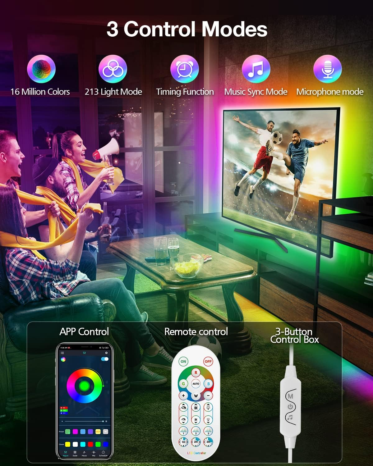 50Ft Usb-Powered RGB LED Strip Lights, Music Sync & Sound-Reactive Color Changin