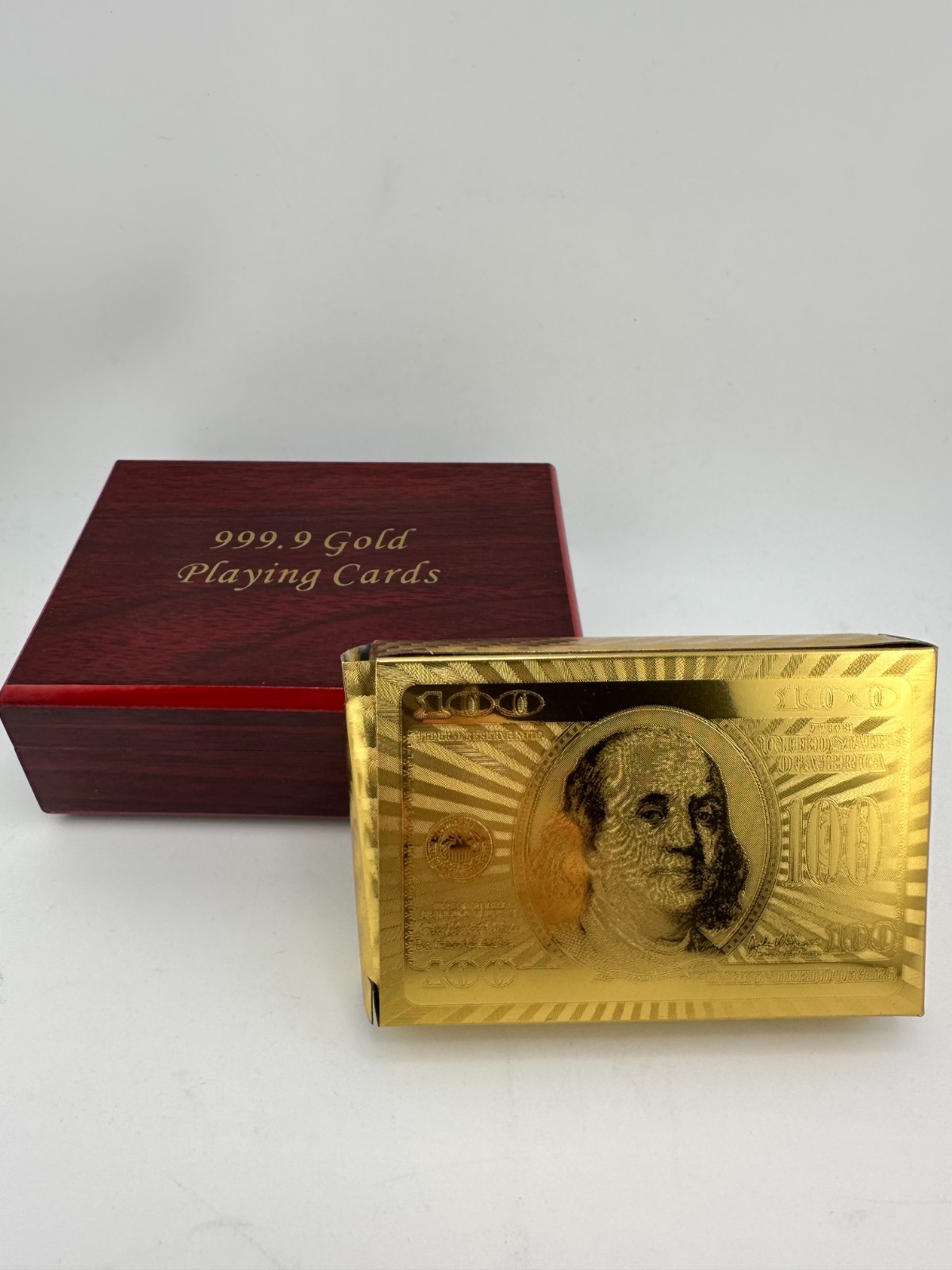 Luxury 999.9 gold-plated playing cards presented in an elegant wooden display box with red velvet interior. This premium novelty deck features full gold-foil cards with classic designs, perfect for collectors, poker enthusiasts, or as a unique luxury gift. Cards remain sealed and unused. A striking display piece for game rooms, offices, or man caves.