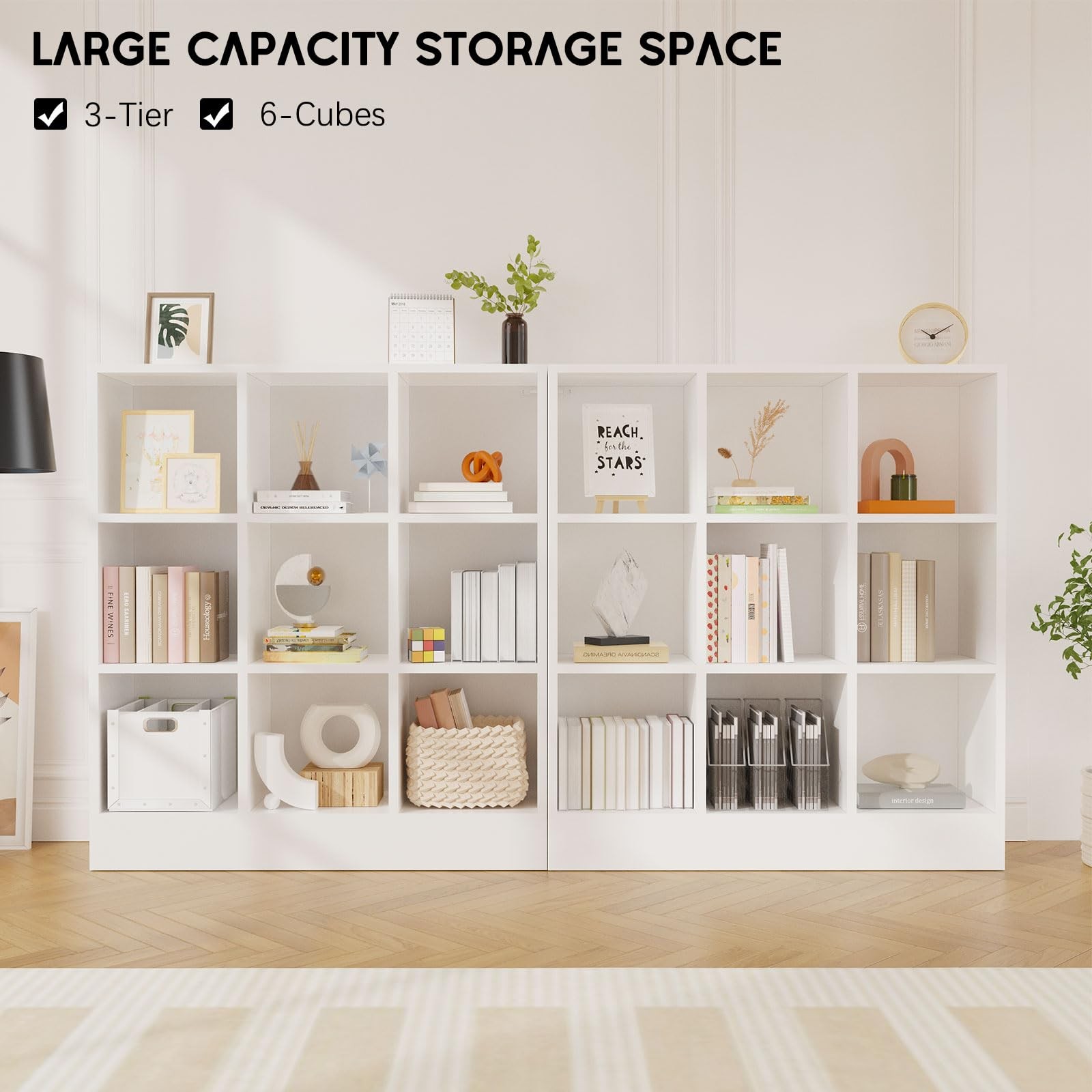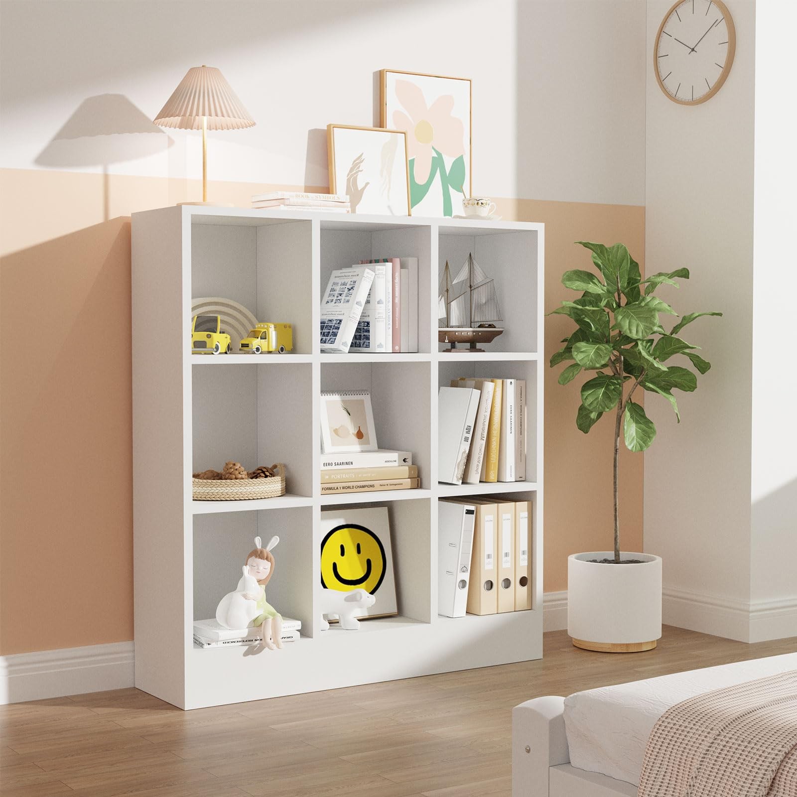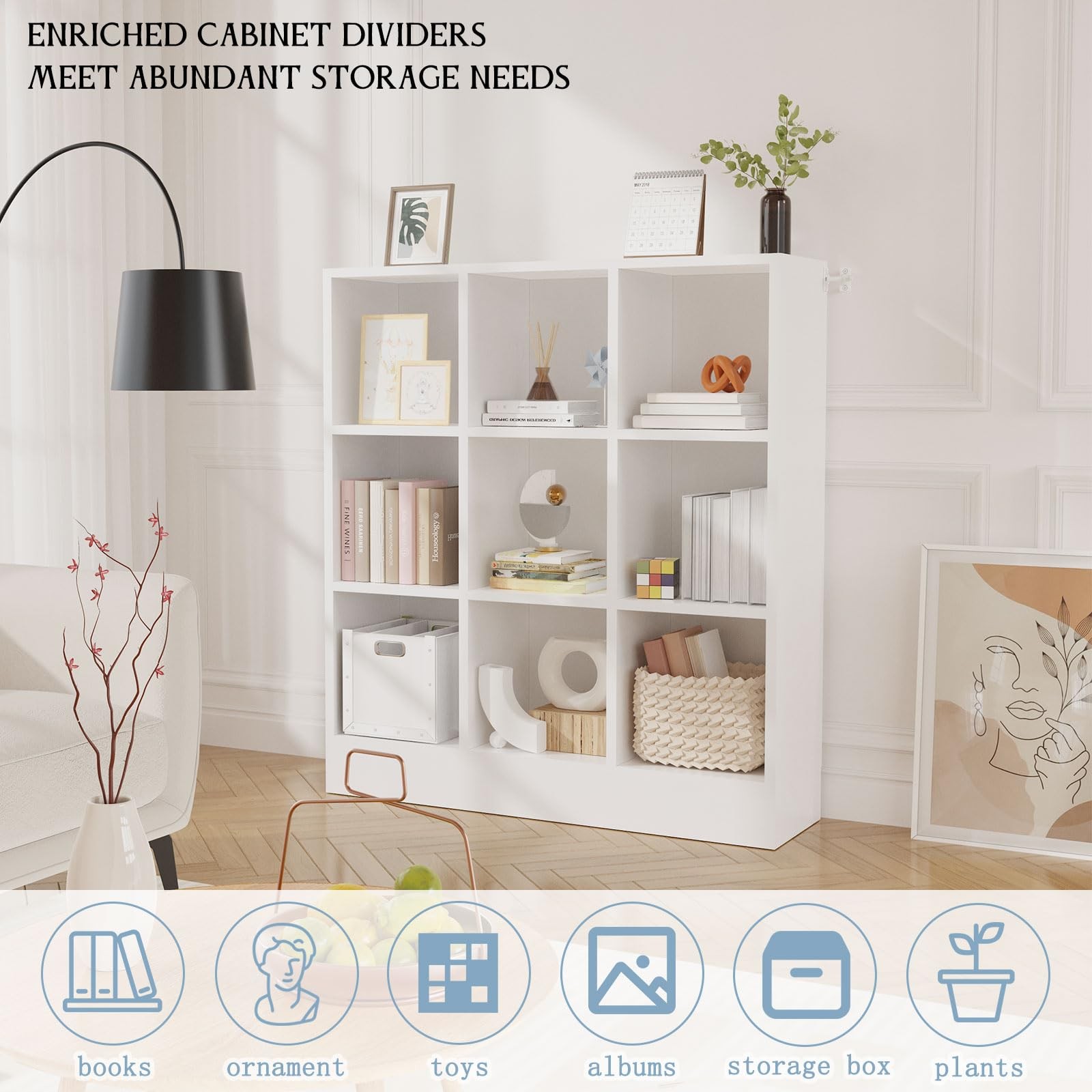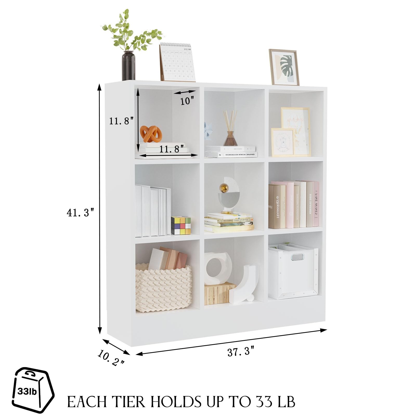 Sleek Modern Aesthetic-Clean lines and a crisp white finish blend seamlessly with any decor style—from minimalist to farmhouse. A timeless addition that elevates your room’s organization without sacrificing style Versatile 9-Cube Organizer-Maximize storage space with 9 uniform square cubes, ideal for books, toys, decor, or office supplies. Perfectly fits in living rooms, bedrooms, home offices, or entryways to keep your space clutter-free Closed Back Panel & Open Design-The sturdy closed back panel prevents dust accumulation and provides structural stability, while the open-front design allows easy access and display of your favorite items Sturdy Enclosed Base-Wood base plate fully shields against dust, pet hair, and small item roll-unders.Reinforced flat-bottom design prevents tipping Sleek Modern Aesthetic-Clean lines and a crisp white finish blend seamlessly with any decor style—from minimalist to farmhouse. A timeless addition that elevates your room’s organization without sacrificing style Effortless Assembly & Space-Saving-Pre-drilled holes and numbered parts enable quick 60-minute setup. Compact depth (10.2”) fits snugly against walls, optimizing small spaces like apartments, dorms, or cozy corners