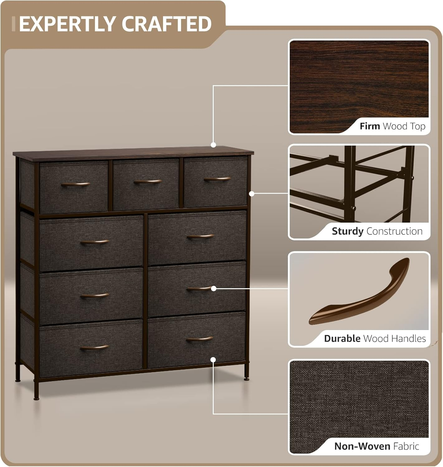 Store New Arrivals Add to Favorite View Feedback Contact Dresser with 9 Drawers - Furniture Storage Chest Tower Unit for Bedroom, Hallway, Closet, Office Organization - Steel Frame, Wood Top, Easy Pull Fabric Bins (Brown) Product Information Item model number DRW-9D-BRN Room Type Bedroom Assembly Required Yes Mounting Type Freestanding Color Brown Material Engineered Wood Finish Type Rustic Furniture Finish Smooth Finish Item Weight 34 pounds Number of Drawers 9 Style American Number of Pieces 1 Special Feature Lightweight,Portable Product Dimensions 11.5"D x 39.5"W x 39.5"H Product Care Instructions Wipe with Dry Cloth Size 11.5"D x 39.5"W x 39.5"H (9 Drawers) ABOUT US We are proud to be based in the United States, with all of our products shipping directly from within the country. Our selection includes home décor, furniture, sports equipment, tools, pet products, and more. If you have any questions about our products, we’re always happy to help. SHIPPING We are always working hard to ensure your package arrives as soon as possible. Please understand that some factors like weather, high postal traffic, and the performance of shipping companies are outside of our control. We offer free shipping to the lower 48 states and ship within 2 business days of payment, usually sooner. For shipping outside of the continental USA, we only use eBay's Global Shipping Program. The item is shipped to IL and then sent to the rest of the world. RETURNS We offer Free Returns for 30-Days on items which you are not completely satisfied with. You have the option for a full-refund or an exchange of the item. CUSTOMER SATISFACTION We try our very best to make sure every customer is completely satisfied. If there's a problem, message us! We're happy to help.
