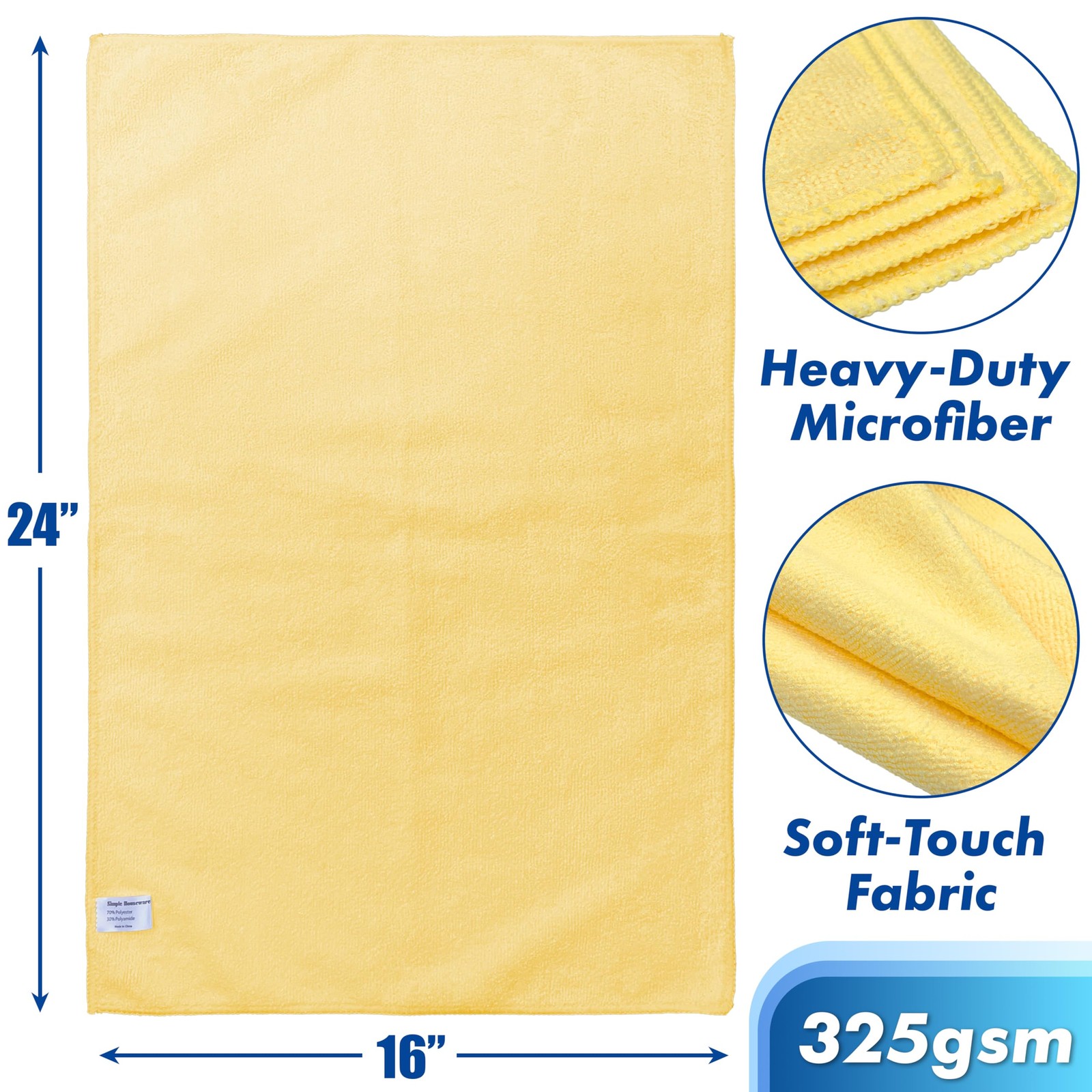 9-Pack Microfiber Cleaning Towels, Heavy-Duty & Reusable Cloths for Home, Kitchen, and Car, 16" x 24", 325 GSM Made for Daily Household Cleaning: Ideal for kitchen counters, sinks, stovetops, bathroom surfaces, mirrors and more; also works great for cars, windows, and general cleaning tasks Premium Weight, Heavy-Duty Performance: Crafted with high-density 325 GSM microfiber for enhanced durability and absorption; heavier and more substantial than standard cleaning towels Soft-Touch and Safe on Surfaces: Non-abrasive texture is gentle on hands, cookware, appliances, and fixtures - perfect for delicate finishes and everyday use Extra Absorbent and Fast Drying: Holds up to 8 times its weight in water, making it ideal for spills, drying dishes, or wiping down bathroom counters Reusable and Eco-Friendly: Use it over 100 times with proper care - a smart and sustainable swap for wasteful paper towels Generous Size and Multi-Purpose: Each towel measures 16" x 24" - large enough for big jobs, yet easy to fold for smaller tasks in kitchen drawers or cleaning caddies