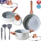 About this item 【Toxin-free non-stick cookware】- SC Cooker cookware is approved by SGS . When you buying our product , Please make sure that it clearly indicates that it is lead,cadmium PFOA-free. You don‘t want to have in your cookware because of their potential health dangers. Fortunately, you can get SC Cooker cookware that is free of these harmful chemicals. 【SC Cooker 9-Piece Cookware Set】- Includes 10 inch Frying Pan with Lid, 2 QT Saucepan with Lid, 2. 7QT Stock Pot with Lid, spoon, spatula and ladle. Our favourite non-stick pots and pans set meets all your needs for everyday cooking. 【Nonstick Cookware Pot】- When buying SC Cooker cookware, The most important things is nonstick capabilities. The ceramic coating do a good job in preventing food from sticking. SC Cooker non-stick cookware has been wear-tested 30,000 times. 【Health & Eco-friendly】Also, you'll be able to cook healthier meals for your family since you won't have to use as much oil. Clean up is a breeze, just wipe it with a rag or rinse with water. Dishwasher safe, hand washing recommended to preserve the nonstick. The nonstick surface makes cooking with little oil for healthy diet, the saucepan can help you solve stick and difficult to clear problem. CO2 emissions can be reduced. This sauce pans for stove top is ECO Friendly. 【Even and Quick Heating】Suitable for Compatible Induction-The base if flat, suitable for all stoves and heats evenly on induction, electric, gas, ceramic and halogen stoves. But Not suitable for Oven. Material:Aluminum Color:White Size:26-18-20cm Handle Material:heat resistant bakelite