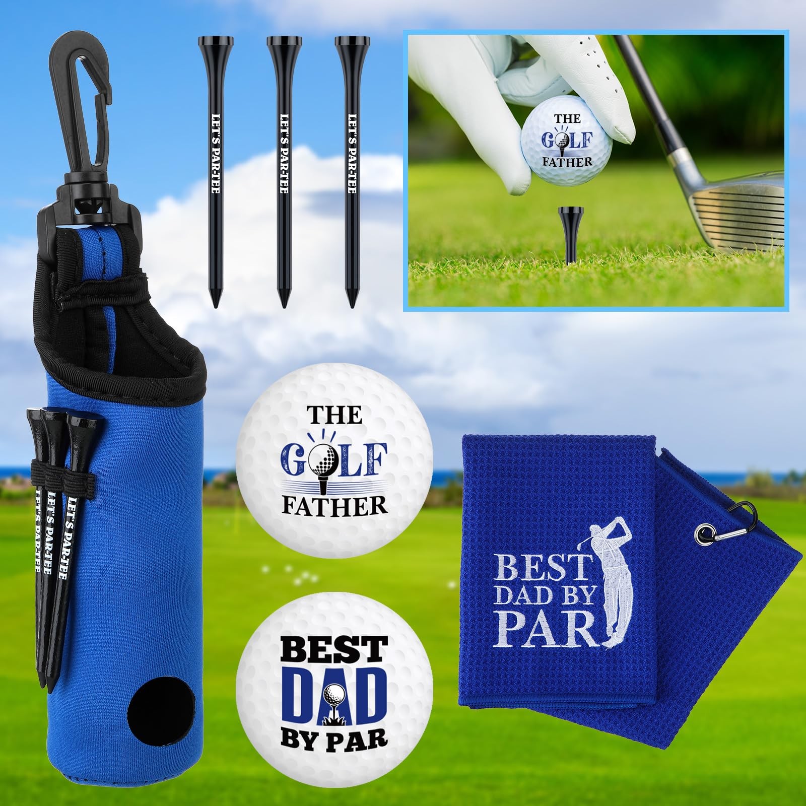 Features: Hook design: Our golf towel, golf club brush, and golf ball bag all have hook designs, which are more convenient to carry, and there is no need to worry about the risk of losing accessories Nice combination: This golf accessories kit is the ultimate combination for golfers, meeting all your various needs. Specifications: Material: cotton (golf towel), ABS plastic (golf divot tool) Color: blue Package includes: 1 x Golf towel 2 x Golf ball 3 x Golf tee holders 1 x Golf brush 1 x Golf divot tool 1 x Golf ball bag Notes: Manual measurement, please allow slight errors on size. The color may exist a slight difference due to different screen displays. Small and pointed items contained, please keep away from little kids. Golf Accessories Kit: The golf accessories kit for man includes all the essentials needed on the course: 1 blue waffle pattern microfiber golf towel, 1 golf cleaning brush, 2 golf ball, 3 golf tee holders, 1 golf divot repair tool, 1 blue portable golf ball bag. This kit is a must-have for every man golfer Waffle Pattern Golf Towel: This 15.7 inch × 23.6 inch microfiber golf towel that is soft, highly absorbent, quick-drying, and offers an satisfactory user experience. The waffle design easily wipes away dirt, mud, and sand. The towel comes with a clip for easy attachment to your golf bag Retractable golf brush: Our golf club cleaner brush is a dual-sided brush with nylon bristles on one side and metal on the other. The strong bristles effectively clean the grooves of golf clubs. The retractable keychain is very flexible and convenient for you to use Foldable Divot Repair Tool: This golf divot repair tool is foldable to prevent the prongs from poking your hand, pocket, or bag during storage, making it safe and easy to carry. To use, simply press the button to extend it Essentials for golf beginners: This golf cleaning kit comes with 2 additional golf ball, 3 tee holders, 1 golf ball bag, making the accessories more comprehensive. It's ideal for golf beginners and also makes an ideal gift for friends or relatives who play golf