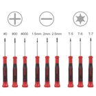 9-Piece Precision Screw Drivers Set contains a versatile selection of the most commonly used sizes, in Phillips, Flat and Torx (Star). It is the perfect choice for your daily electronics device repairs, including smart cell phones (fits smartphones Apple iPhone 6 6S 7 7S 8 8S Plus X and Samsung note galaxy S5 S6 S7 S8), tablets such as iPad Air, laptops, Mac, Macbook Pro, desktops, computers, cameras, printers, thermostats, game stations, wii, watches, even eyeglasses, jewelry, guitar and a lot more. Constructed from premium chrome vanadium steel with a corrosion-resistant chrome plated finish, these screwdrivers are built to last. All the tips and heads are precisely milled through CNC machine for accurate size that fits exact fastener. Tips are also magnetic and prevent dropped fasteners during installation and removal. Comfortable rubber handles provide a non-slip grip during use. Swivel end caps allow for constant finger pressure while driving. They meet or exceed ANSI standards. Kit includes 3 pc. Phillips sizes #0, #00, #000; 3 pc. Slotted sizes 1.5mm, 2.0mm, 2.5mm; and 3 pc. Torx sizes T5, T6, T7. High strength chrome vanadium steel shafts reduce wear-outs and stripping for longer tool life Corrosion and rust resistant chrome plating finish provides durability and longevity Precisely machined and magnetized tips for easy holding fasteners to start screwing and also prevent fasteners dropping after unscrewing Swivel end cap allows constant finger pressure while driving and non-slip rubber handle grips for maximum turning power Set includes total 9 pieces mini screwdrivers: (3) Phillips #0, #00, #000; (3) Slotted 1.5mm, 2.0mm, 2.5mm; (3) Torx Star T-5, T-6, T-7