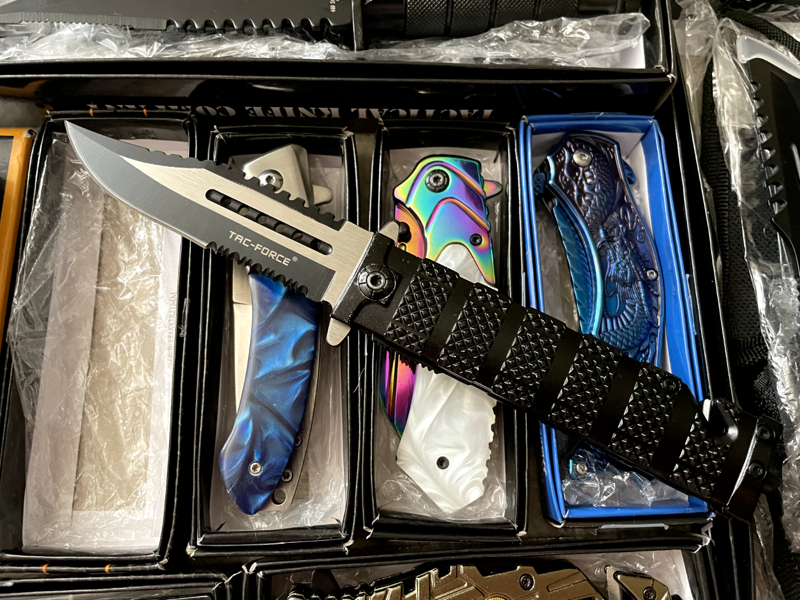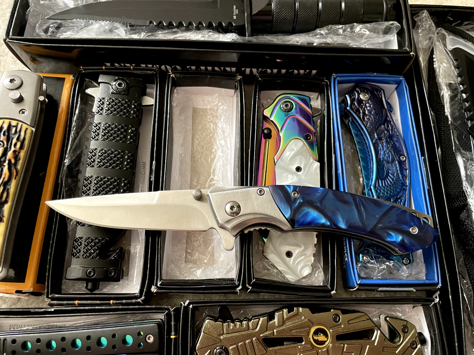 Lot of 9 mixed knives, including hunting, tactical, folding, pocket, fixed blade, survival, and EDC knives. These knives come in various brands and styles, making them a great choice for collectors, resellers, outdoor enthusiasts, or anyone looking to expand their knife collection. All knives are NEW and in GOOD condition, ensuring quality and reliability. Each knife in this lot typically costs between $20 to $30 , offering excellent value for anyone looking to save money on premium knives. Whether you're into camping, hunting, fishing, self-defense, survival, or everyday carry (EDC) , this set has something for you. This is a great deal for anyone looking to resell, start a collection, or stock up on quality knives. Fast shipping ensures you'll receive your knives quickly. Sold as-is with no returns. Don’t miss out—grab this knife lot before it's gone!