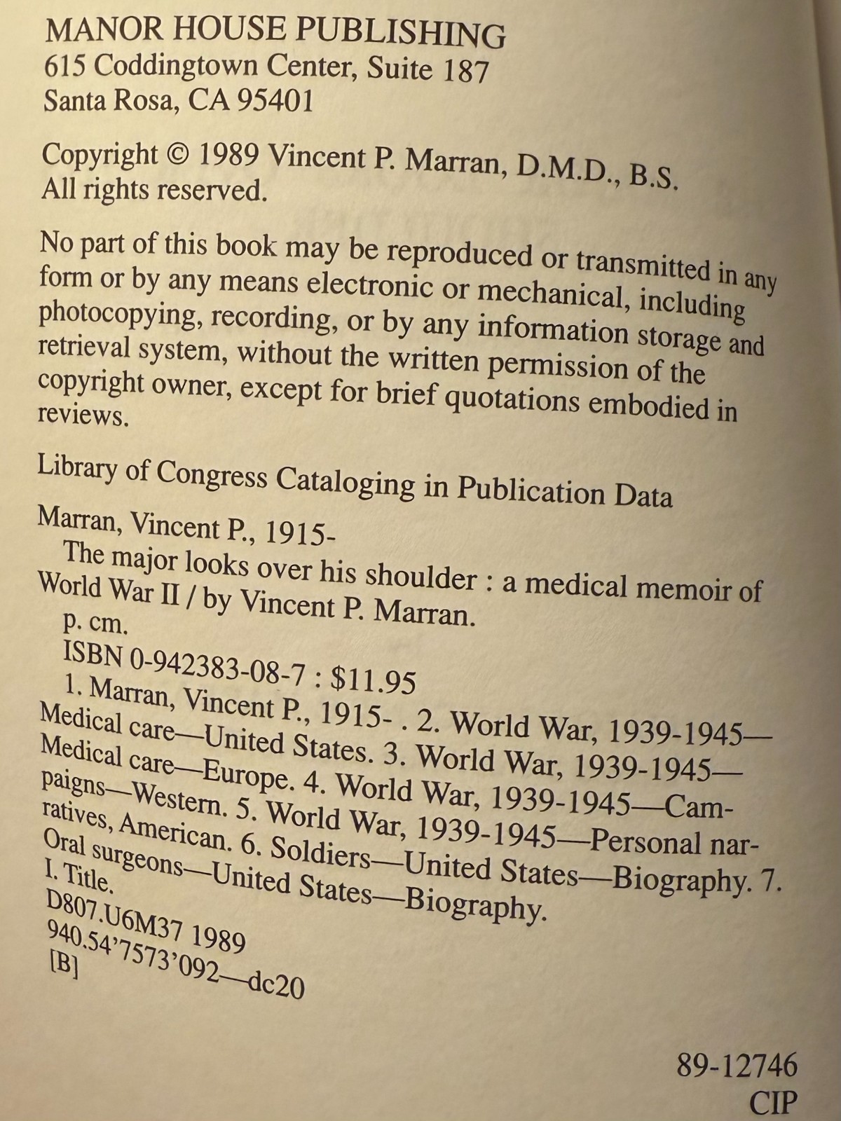 This product is a first edition nonfiction book titled "THE MAJOR LOOKS OVER HIS SHOULDER" by a WW2 Doctor (in maxillofacial and orthodontic surgery) who served in the European Theater with the 3rd Army. The author's medical memoir focuses on their experiences during the war, including some details about the maxillofacial and orthodontic surgeries performed on patients during that time. The book is written in English and published in the United States. It offers a unique perspective on the medical aspects of World War II, as well as the specific roles of doctors and medical technicians in the European Theater. PUBLISHED BY MANOR HOUSE PUBLISHING
