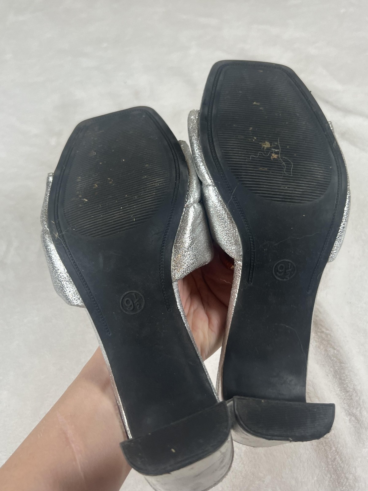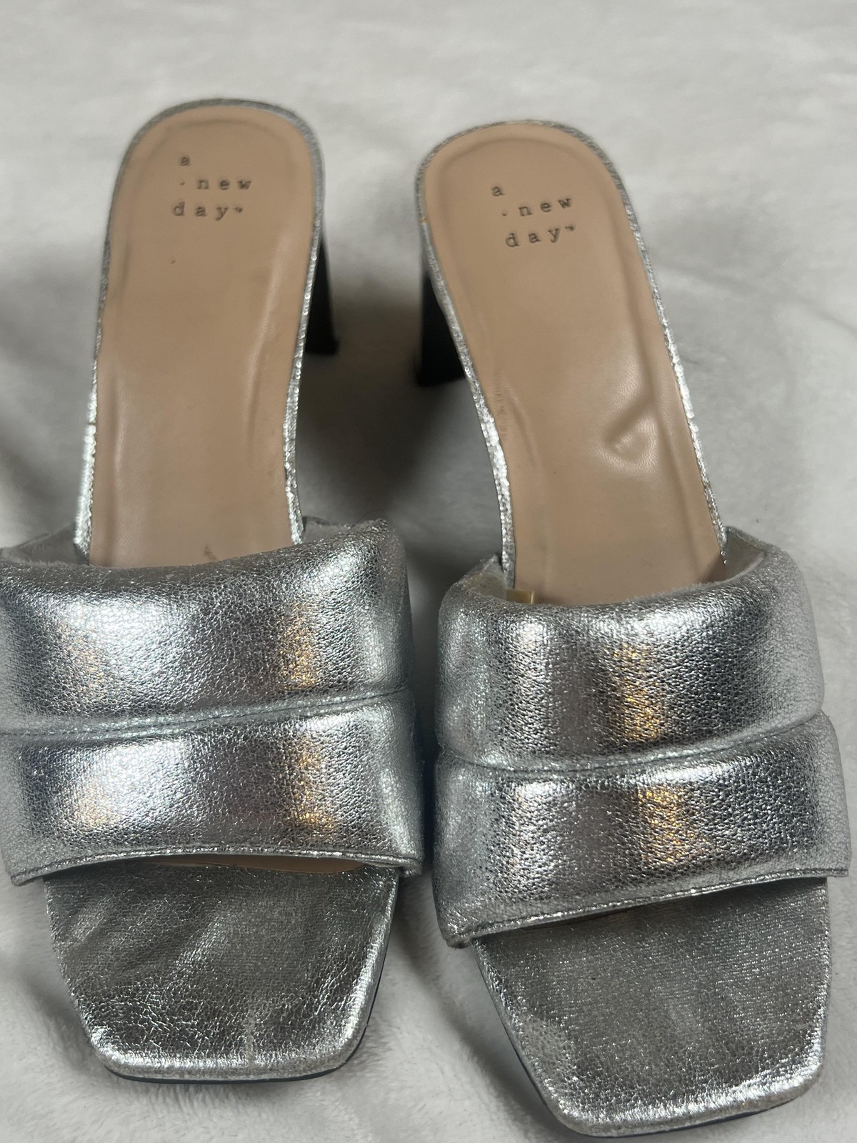 Brand: A New Day Style: Womens mule heel slide shoes with wide padded straps and open square toes. Color: Metallic silver uppers with black block heels and tan footbeds. Size: Womens US 9.5; "9 1/2" stamped on the outsoles. Materials: Synthetic uppers, synthetic lining and insoles, manmade rubber outsoles. Details: Slip-on backless mule silhouette, double-layer padded strap across the vamp, mid-height block heels, modern square open toe, A New Day branding printed on insoles, sleek metallic finish ideal for parties, evenings out, or dressy casual outfits.