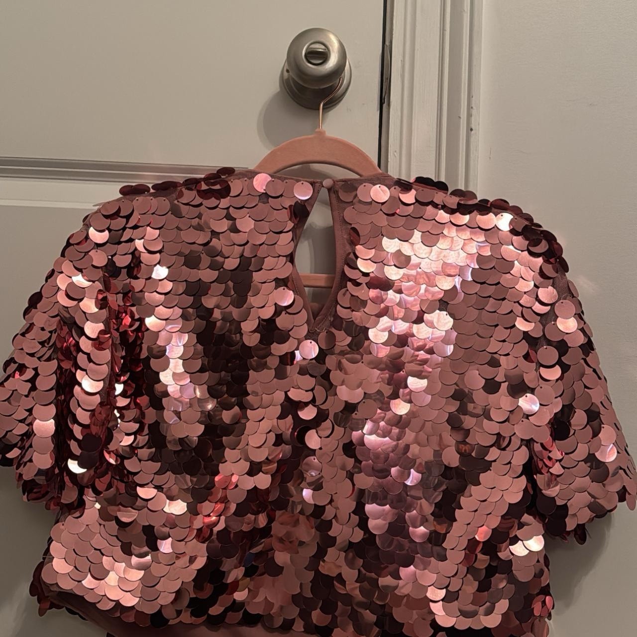The A New Day Pink Sequin Crop Top in women's size large is a stylish and eye-catching piece perfect for various occasions such as Valentine's Day, parties, birthdays, or formal events. The top features short sleeves, a round neckline, and a button closure for a trendy and comfortable look. Made of polyester material, this blouse adds a touch of sparkle with its sequin accents, making it a versatile and fashionable addition to your wardrobe. With a relaxed fit and cropped style, this top is a must-have for the fashion-forward woman looking to make a statement.