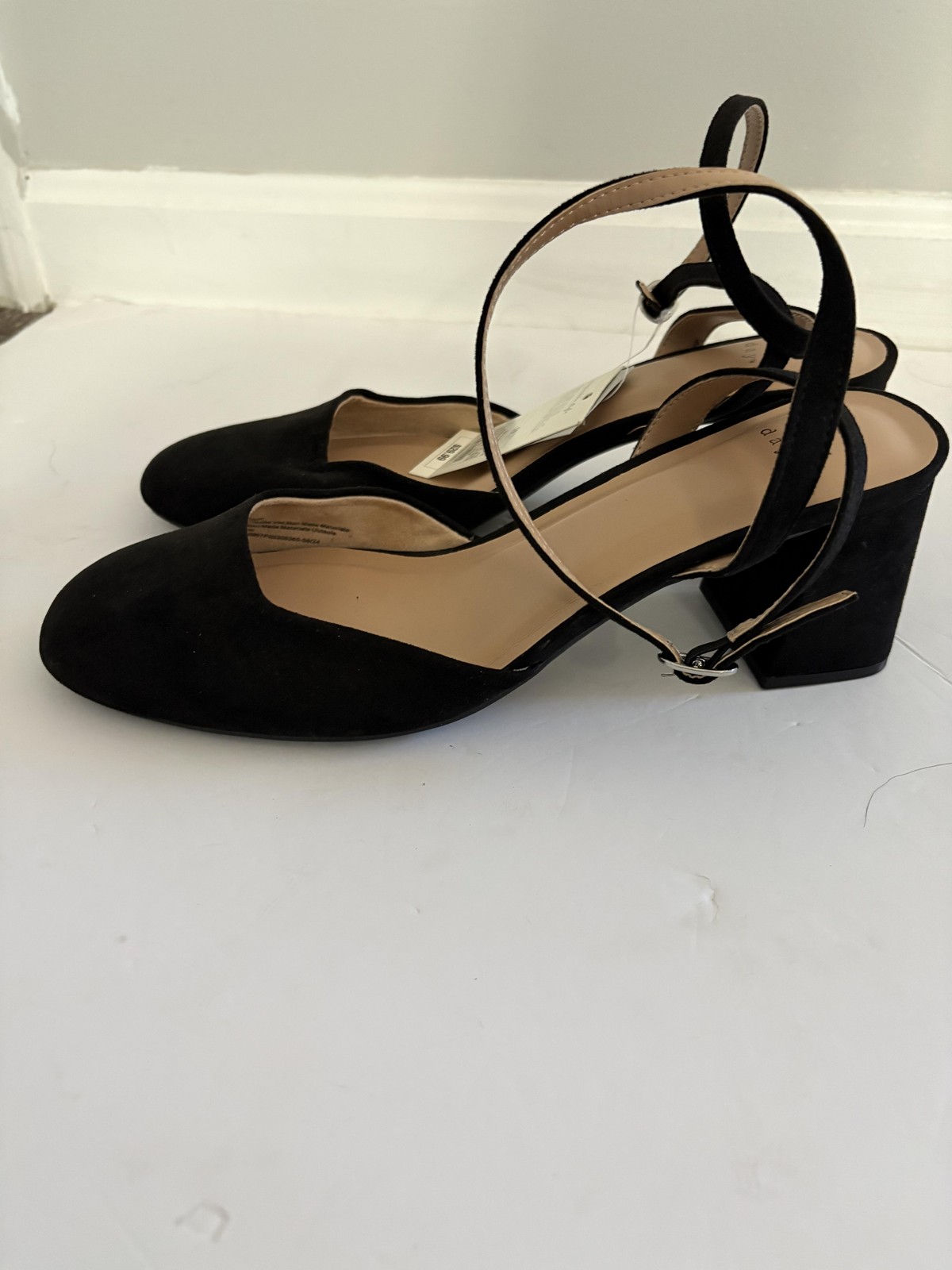 Brand: A New Day Model/Style: Alexa ankle-strap block heel closed-toe pumps Color: Black Womens Size: 11 Brand markings: "a new day" printed on insoles; size "11" molded on outsoles Tag details: Responsible Style hangtag; price tag shows $29.99 Materials: Upper made with at least 50% recycled polyester (excluding ornaments, adhesives, and linings) Country of origin: Made in China Features: Adjustable ankle strap with buckle; cushioned footbed; sturdy block heel; synthetic outsole Notes: Color tone may vary by screen; compare sizing to a similar pair for best fit.