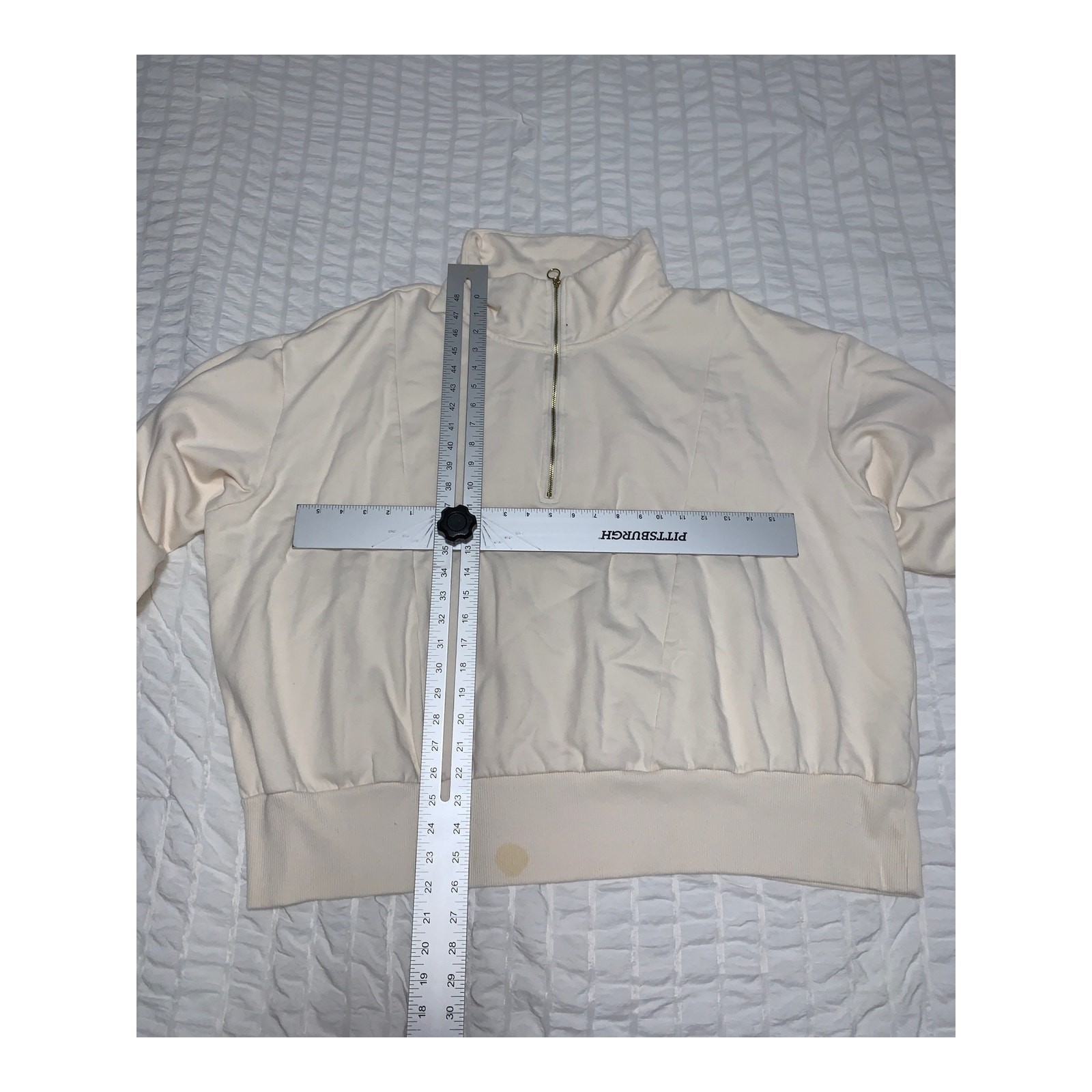 Casual and cozy A New Day ¼ zip pullover in a soft cream color, size 4X plus. This sweater features a mock neck and a quarter-length zipper, ideal for layering in cooler weather. It’s pre-owned in good condition with light signs of wear—normal pilling or slight discoloration may be present. Please review all detailed pictures carefully, as they provide the most accurate representation of the garment’s condition, including any imperfections or wear. ** has small stain as shown in photo**