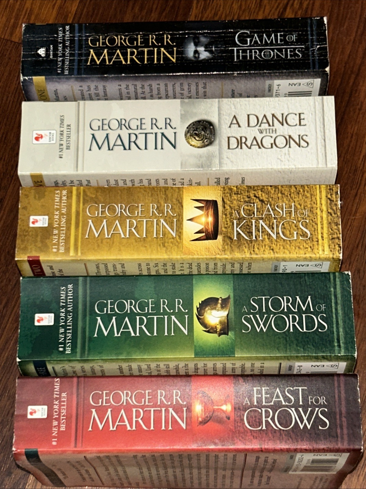 The product is a complete set of the first five books in the "A Song of Ice and Fire" series by George RR Martin, including "A Dance with Dragons." These fantasy novels are intended for an adult audience and are published by Bantam Books in English. The set is in paperback format and covers the genre of fantasy and high fantasy, making it a compelling read for fans of the series and the author's unique storytelling.
