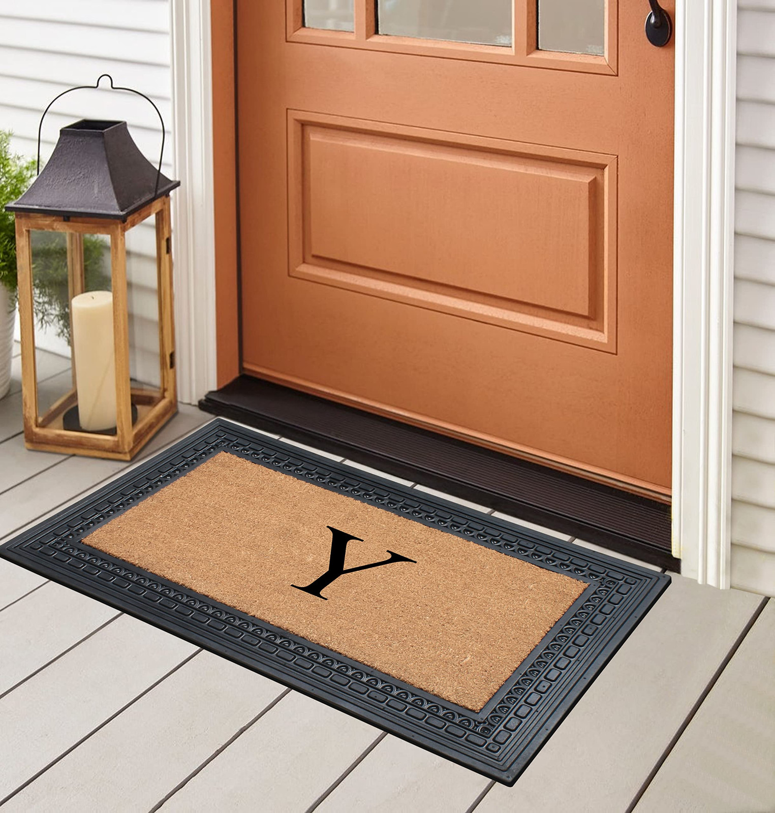 Like all of our door mats, our Monogrammed Coco Door Mat is as durable as it is beautiful. Handmade from 100% coir, an all-natural material known for its scrubbing power and resistance to the elements. Dyes saturate the fibers for vibrant color. Specify you single-letter monogram for the perfect finishing touch, or enjoy the classic border motif alone NEWLY DEVELOPED RUBBER AND COIR MONOGRAMMED DOOR MAT : This is a completely newly designed door mat, suitable for both single and double doors. The large size monogrammed door mat is made of Natural Coir fiber and high quality rubber. This coir door mat has a large coir area to clean and wipe your shoes which keeps your house clean. Molded door mats are stronger and more durable lasting thrice as long as regular door mats. Each outdoor rug is QC inspected for 20 quality check points. NATURAL COIR PILE MONOGRAMMED FRONT DOOR MAT: This Door mat is made from 100% natural coir fibers which are of the strongest fibers and they naturally trap dust and other particles. The biodegradable coir fiber material is environmentally friendly and compostable. HEAVY DOOR MAT WITH RUBBER BACKING: This Doormat is heavy weight with a solid rubber backing. This door mat doesn’t get easily blown away by wind and anchors to the ground to prevent slipping. ATTRACTIVE DESIGN AND ANTI SHED TREATED FRONT DOOR MAT: This is a personalized designed door mat and every door mat is Hand monogrammed individually in the USA. The coir portion of this door mat is treated with Anti Shed dyes to minimize shedding. The rubber molded doormat easily lasts 3 times longer than usual doormats since the rubber adds to the durability making it suitable for high traffic areas. LOW MAINTENANCE OUTDOOR MAT: Coconut coir is naturally resistant to unwanted substance, making this the most low-maintenance door mat possible.