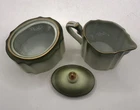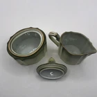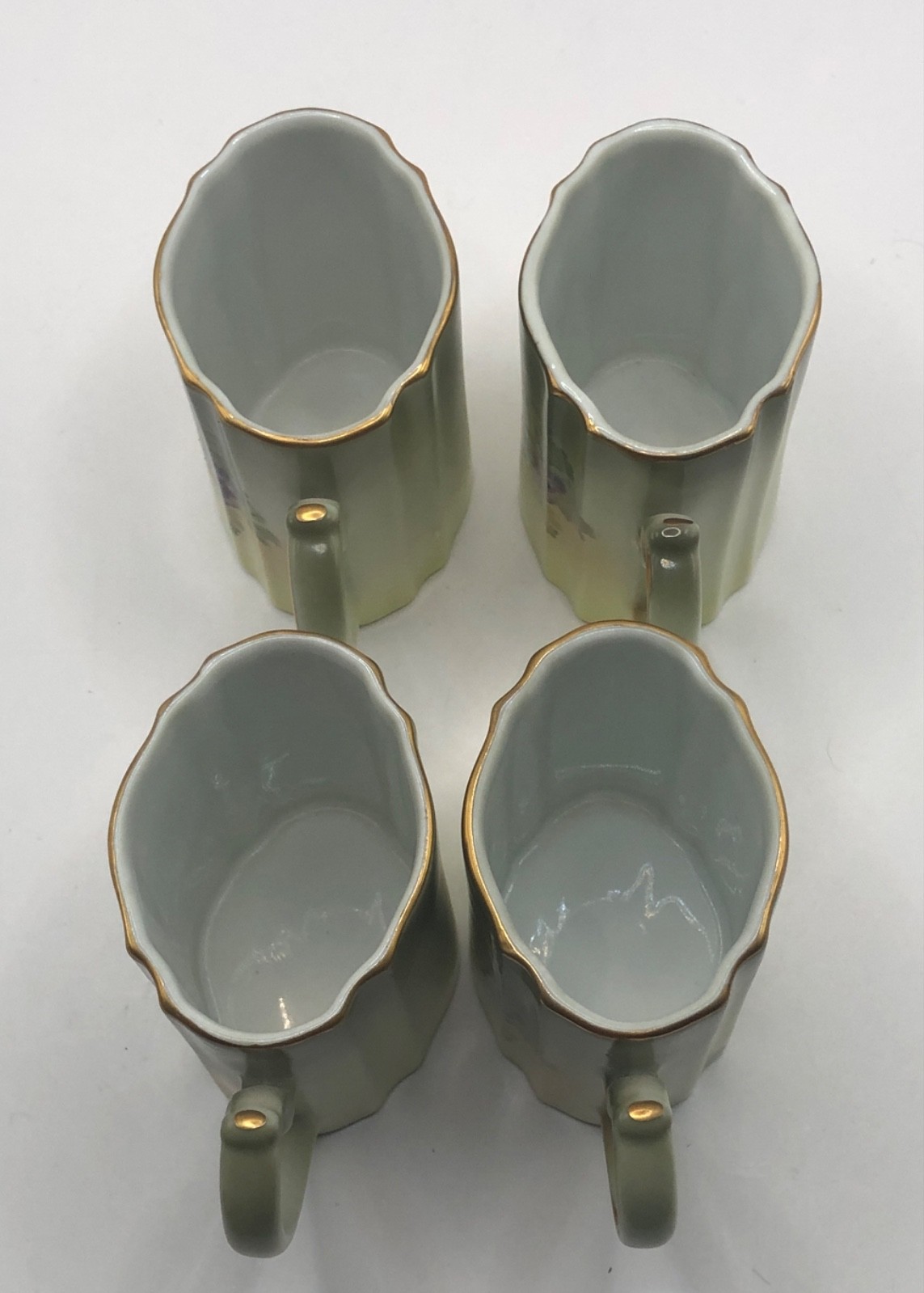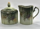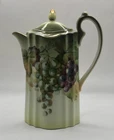 The A&C Bavaria 9 Piece Chocolate Pot Set is a vintage collectible from Germany, perfect for all occasions. This novelty-shaped chocolate pot set includes 4 cups, a creamer, and a sugar bowl, all made of porcelain with a bisque finish. The set features a lid, signed pot, with a 1 qt capacity and a whimsical grape pattern, adding a touch of seasonal charm to your kitchen decor. Hand wash only to preserve the antique beauty of this original Bavaria brand set.