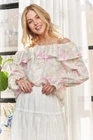 The Ruffled Off Shoulder Floral Blouse showcases a charming floral print and feminine ruffled details. This blouse features an off-shoulder design for a trendy look. Perfect for adding a touch of romance and elegance to your outfit, making it a stylish choice for both casual and dressier occasions. Features: Frill, Ruffled Stretch: Slightly stretchy Material composition: 100% POLYESTER Care instructions: Machine wash cold. Tumble dry low. Imported Product measurements: S/M:Bust 34-36 in, Waist 26-28 in M/L:Bust 37-38 in, Waist 29-31 in